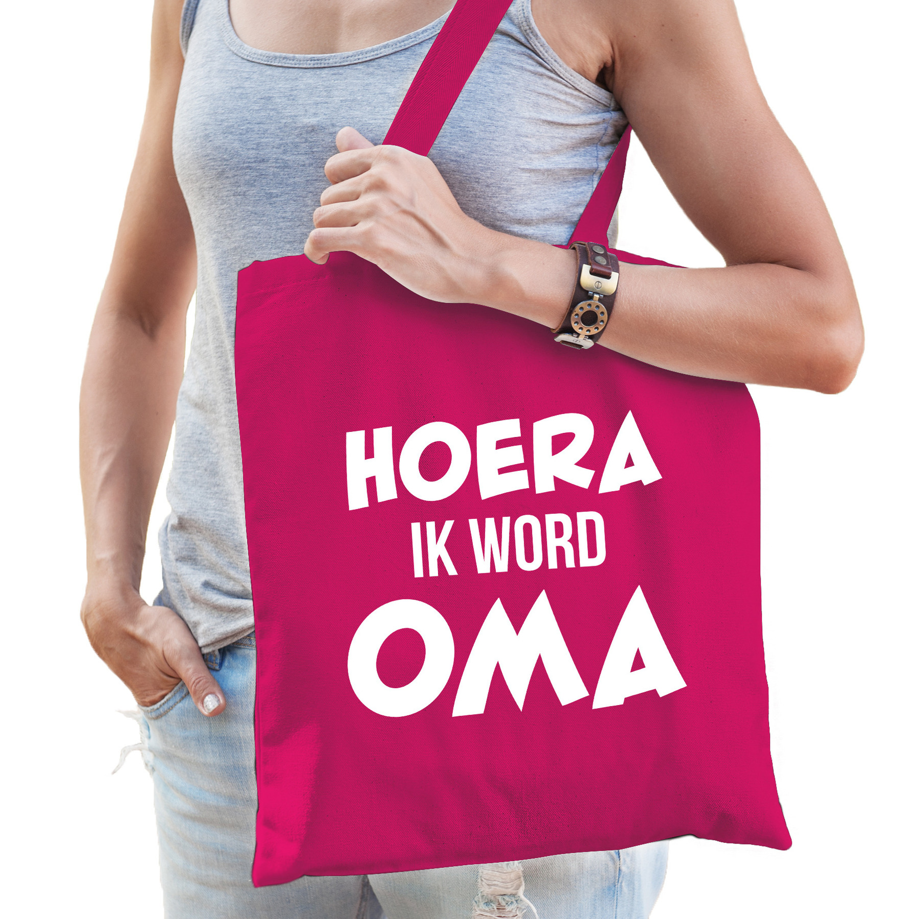 Cadeau tas oma – Hoera ik word oma cadeau katoenen tas fuchsia roze voor dames. Op dit fuchsia roze katoenen tasje staat in witte letters de tekst: Hoera ik word oma.