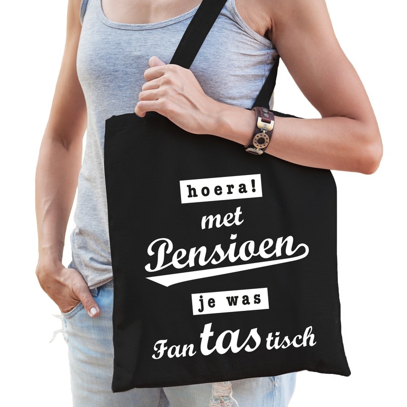 Katoenen pensioen cadeau tasje Hoera met pensioen je was fantastisch. Leuk om cadeau te geven aan iemand die met pensioen gaat. Dit zwarte katoenen tasje is eenzijdig bedrukt met de tekst Hoera! met pensioen je was fanTAStisch.