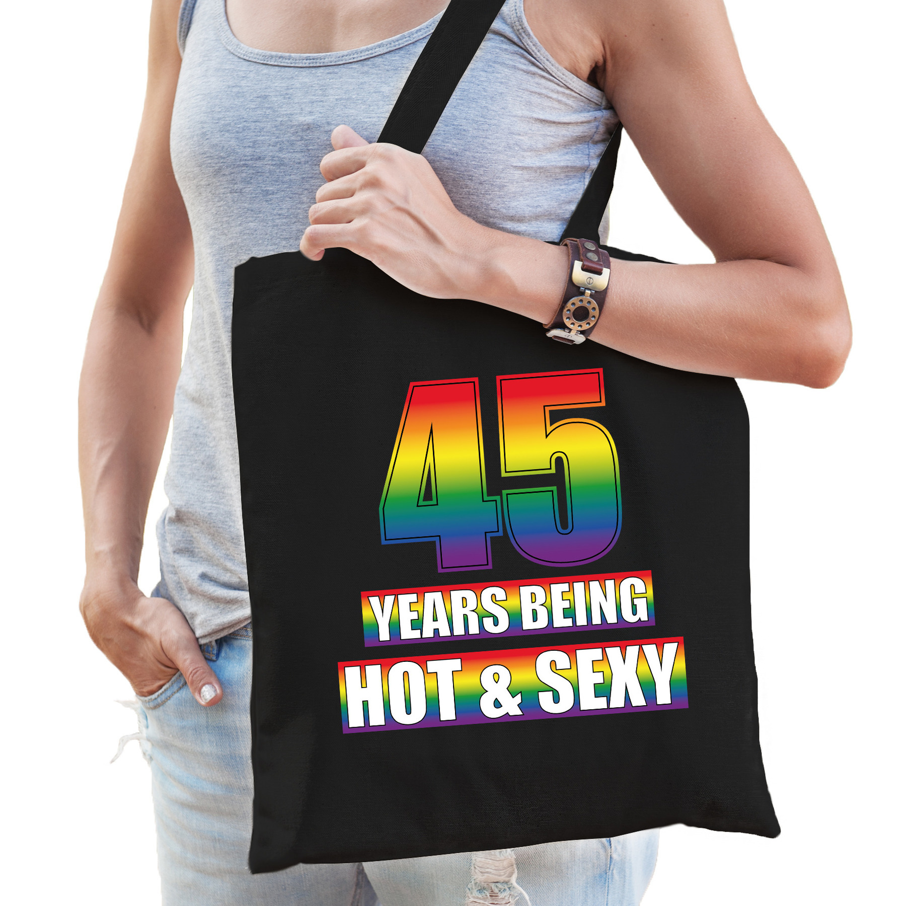 Hot en sexy 45 jaar verjaardag cadeau katoenen tas zwart voor volwassenen. Dit zwarte katoenen tasje is eenzijdig bedrukt in regenboog letters met de tekst: 45 years being hot & sexy. Het cadeau tasje is leuk om cadeau te geven voor iemand zijn 45e verjaardag. Ook leuk om er bijvoorbeeld cadeaus in te doen en die aan de jarige te geven! Formaat vak: 42 x 38 cm. Totale lengte inclusief hengsel: 67 cm. Materiaal: 100% katoen, 130 grams kwaliteit. Inhoud: 10 liter.