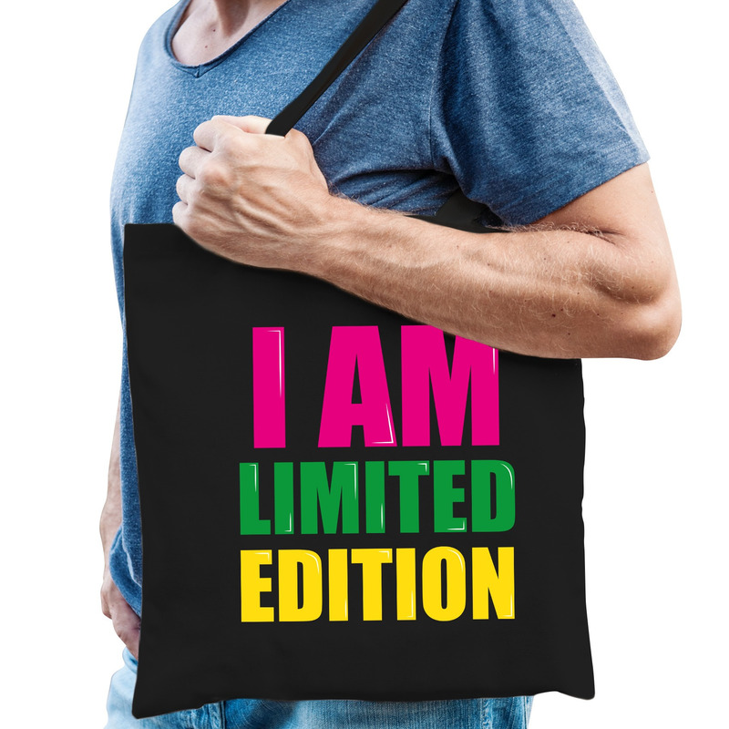 I am limited edition fun tekst kado katoenen tas zwart voor heren. Dit zwart katoenen tasje is eenzijdig bedrukt met de tekst: I am limited edition.