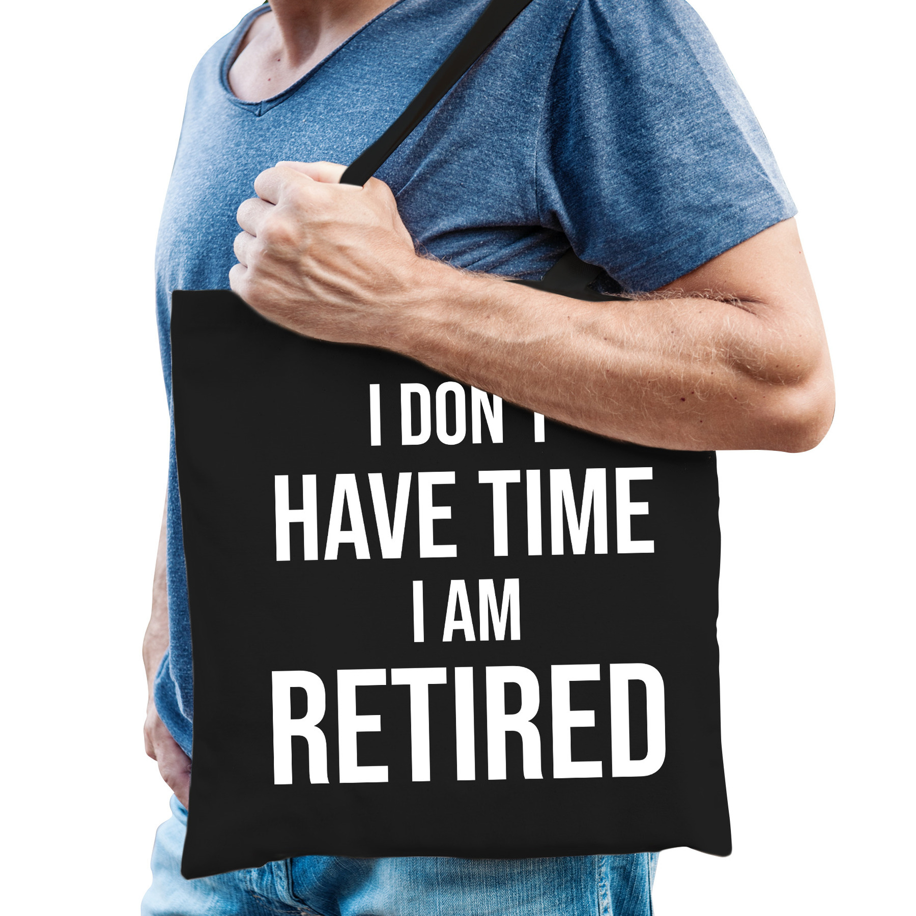 I don’t have time i am retired cadeau tasje zwart voor heren. Op dit zwarte pensioen tasje staat in grote witte letters de tekst: I DON’T HAVE TIME I AM RETIRED. Het tasje is leuk om kado te doen aan iemand die met pensioen / de VUT gaat. Ook leuk om de tas te vullen met kleine cadeaus en die te geven op het pensioen afscheidsfeestje.