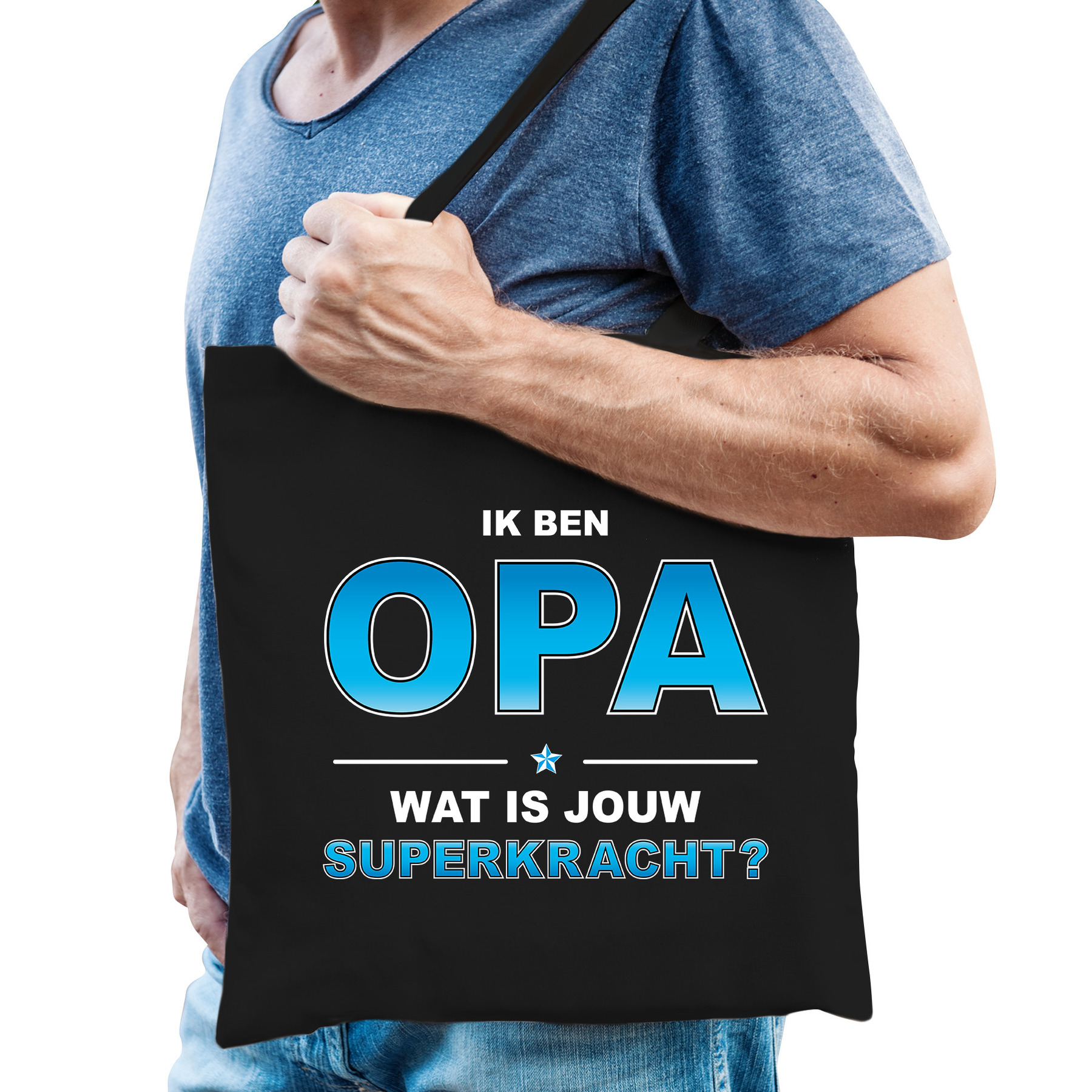 Cadeau tas opa – ik ben opa wat is jouw superkracht tasje zwart voor heren. Op dit zwarte tasje staat in blauwe letters de tekst: ik ben opa, wat is jouw superkracht? Is uw opa de beste? Dan is dit een leuk verjaardag cadeau tasje of natuurlijk voor een andere gelegenheid.