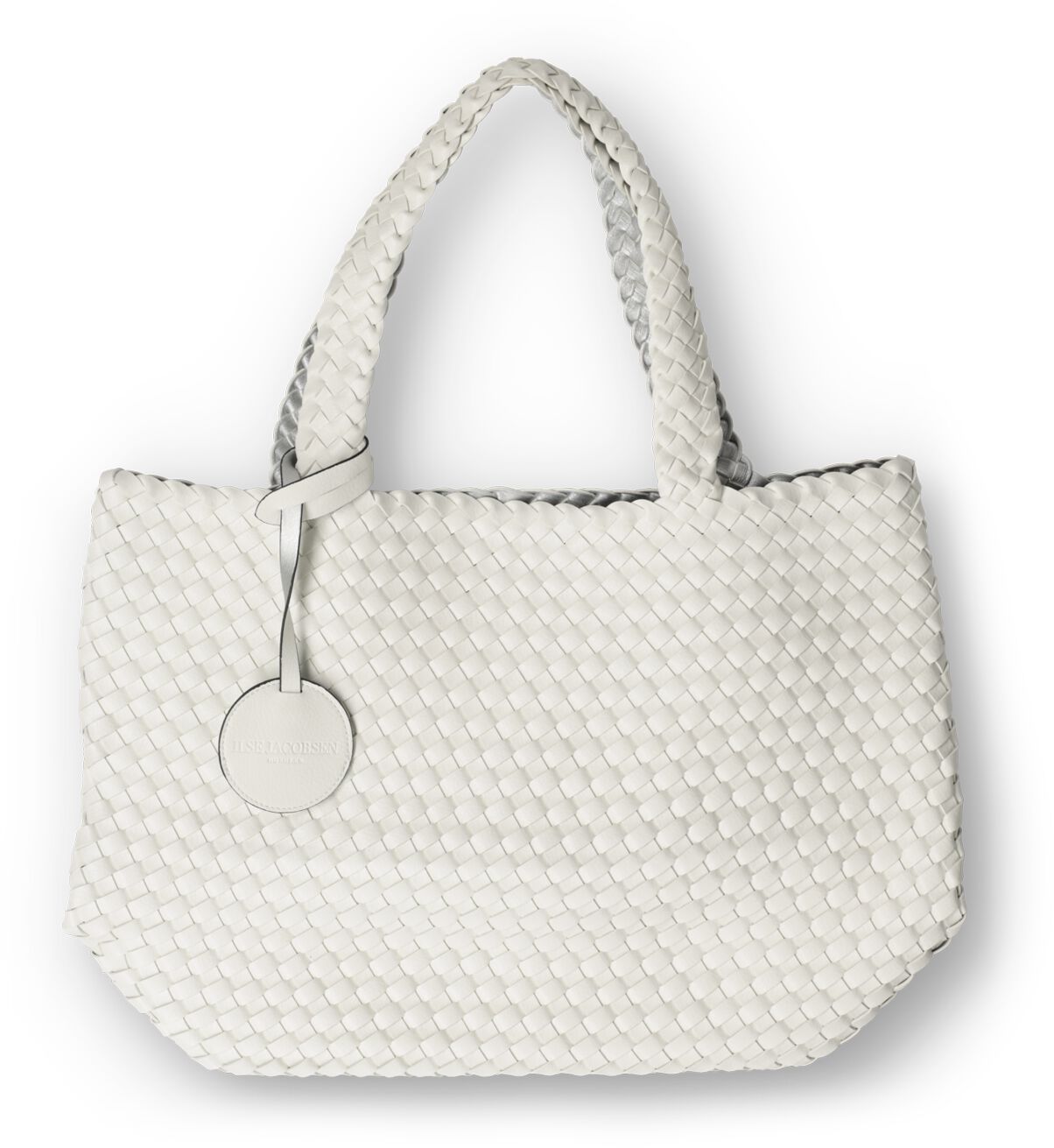 Deze witte schoudertas TOTE BAG08 van het merk Ilse Jacobsen is uitgevoerd in gestructureerd leatherlook met een zomers vlechtwerk en brede schouderbanden van ditzelfde gevlochten leatherlook. De tas is extra leuk omdat hij reversible is, waardoor je ook de zilverkleurige binnenkant naar buiten zou kunnen dragen. Afmetingen: 33 x 15 x 28 centimeter.