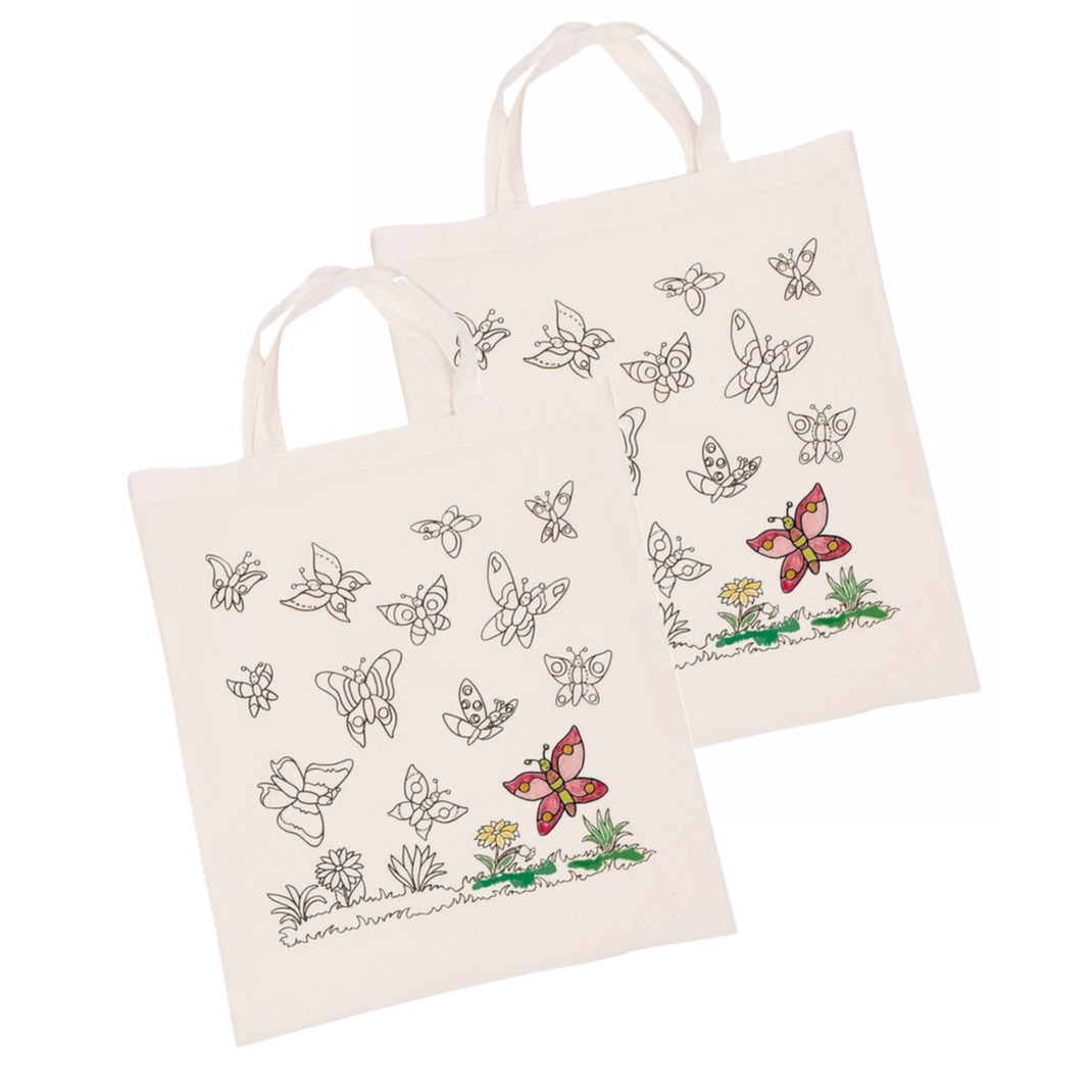 2x inkleurbaar tasje met vlinder motief. Een tas met vlinders motief welke ingekleurd kan worden met bijvoorbeeld waskrijtjes. Laat je creativiteit de vrije loop met dit inkleurbare tasje met prachtig vlindermotief! Gemaakt van 100% fairtrade katoen en met een afmeting van 38 x 42 cm is dit tasje ideaal voor knutselactiviteiten, cadeaus, en dagelijkse boodschappen. Het tasontwerp nodigt uit tot kleuren en personaliseren, wat het perfect maakt voor kinderen en volwassenen die graag hun eigen stijl willen cre?ren.