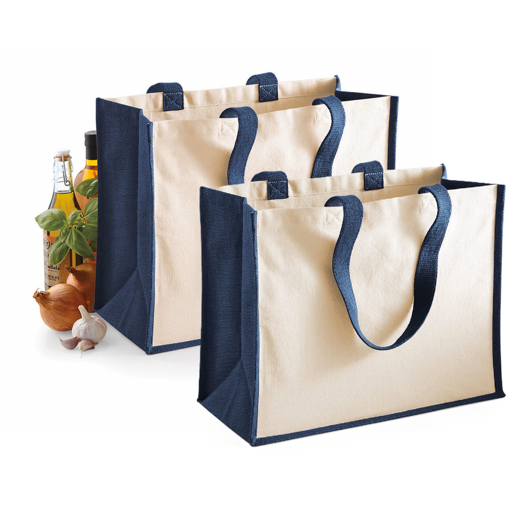 2 stuks jute katoenen boodschappentas of draagtas in de kleur donkerblauw/natural met afmetingen van ongeveer 44 x 33 x 19 cm. Inhoud: 20 liter. Natuurlijk materiaal. De hengsels zijn 65 cm. Multi functionele schoudertas/strandtas/boodschappentas voor iedereen.