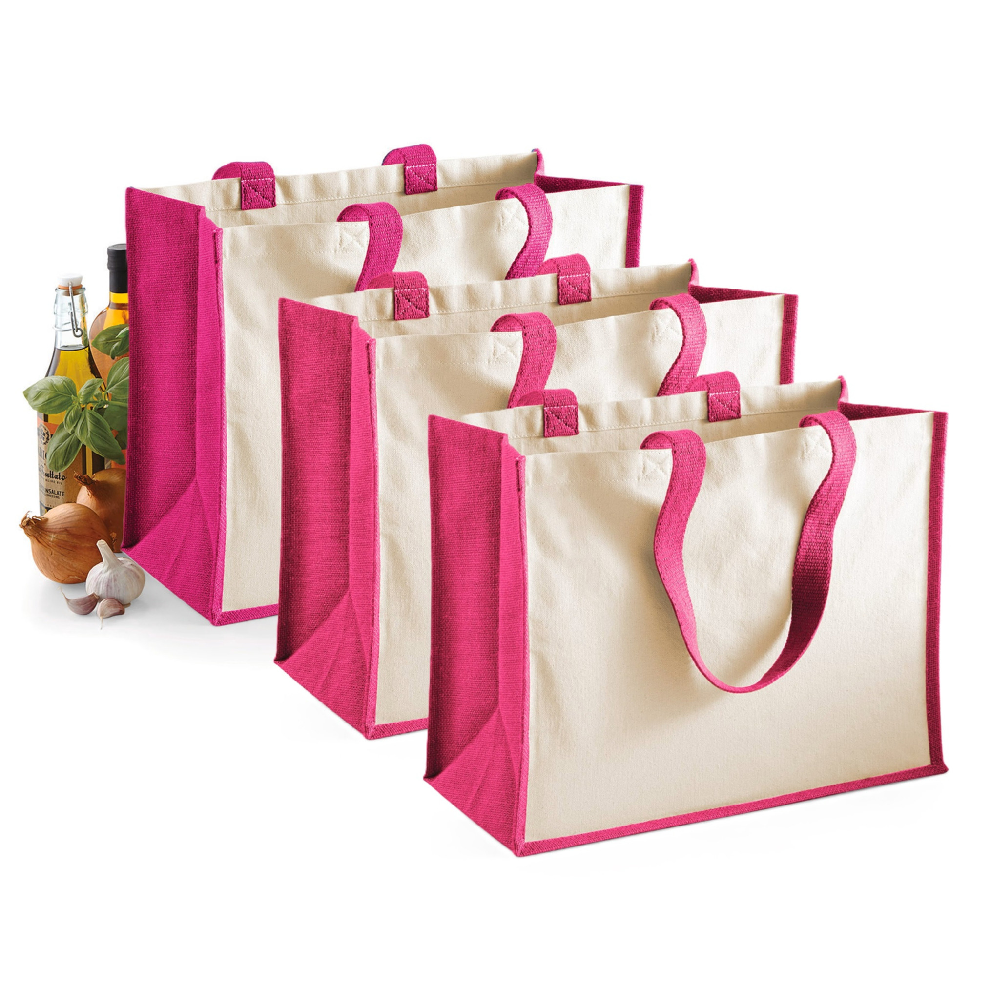 3 stuks jute katoenen boodschappentas of draagtas in de kleur roze/natural met afmetingen van ongeveer 44 x 33 x 19 cm. Inhoud: 20 liter. Natuurlijk materiaal. De hengsels zijn 65 cm. Multi functionele schoudertas/strandtas/boodschappentas voor iedereen.