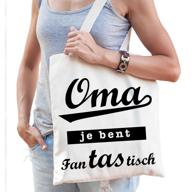 Katoenen tasje Oma je bent fanTAStisch. Leuk om cadeau te geven aan je oma/grootmoeder. Dit naturel kleurige katoenen tasje is eenzijdig bedrukt met de tekst Oma je bent fanTAStisch.