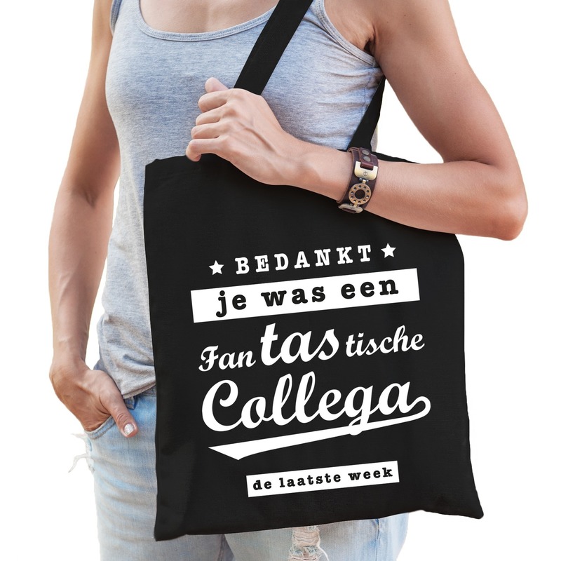 Katoenen collega kado tasje Bedankt je was een fantastische collega in de kleur zwart. Leuk om cadeau te geven aan een collega voor bijvoorbeeld een afscheid of pensioen. Dit zwart katoenen tasje is eenzijdig bedrukt met de tekst Bedankt je was een fanTAStische collega de laatste week.