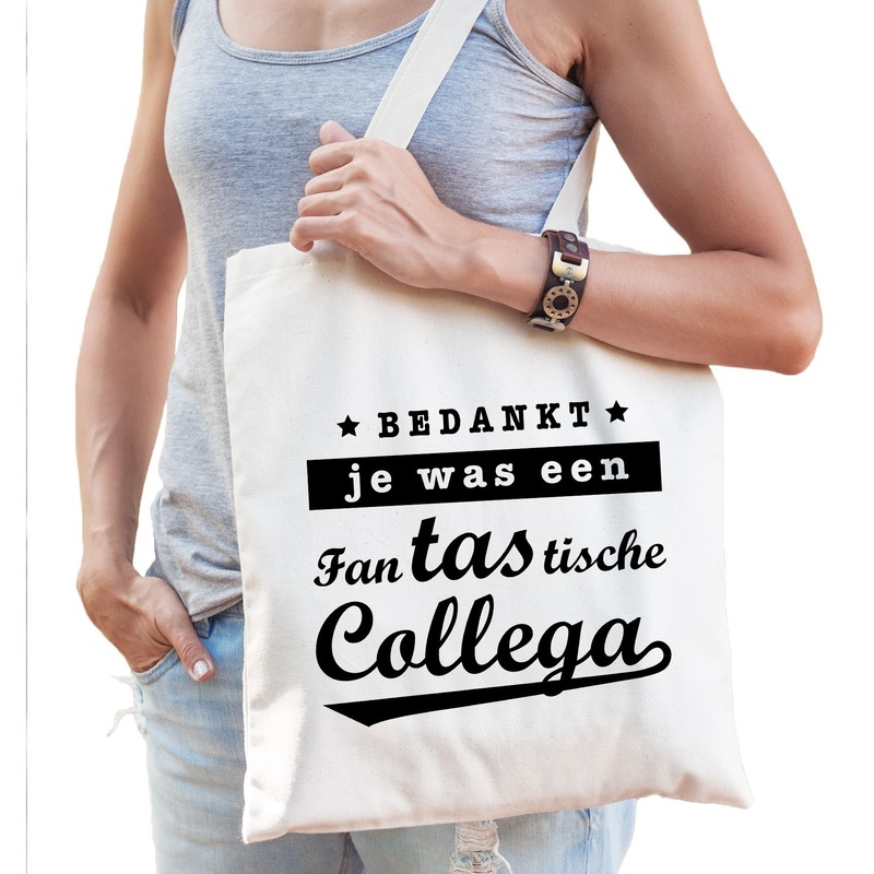 Katoenen collega kado tas / shopper met de tekst: Bedankt je was een fantastische collega, in naturel voor dames. Deze tas / shopper is leuk om cadeau te geven bijvoorbeeld bij het vertrek van een collega. Cadeau idee voor een medewerker die met pensioen gaat of een andere baan heeft. Dit naturel katoenen tasje is eenzijdig bedrukt met de tekst: Bedankt je was een fantastische collega.