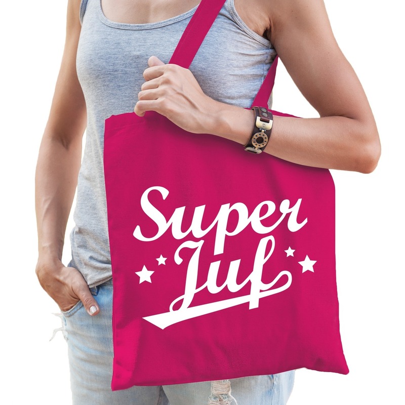 Katoenen kado tasje super juf. Leuk om cadeau te geven aan de juf aan het einde van het schooljaar, of op juffendag. Dit knalroze katoenen tasje is eenzijdig bedrukt met de tekst super juf.
