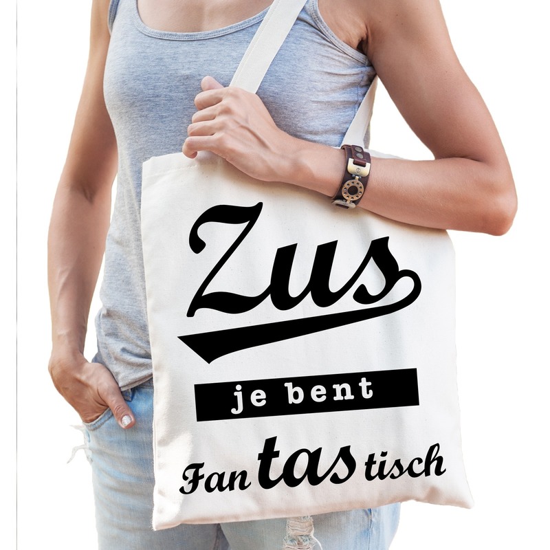Katoenen tasje Zus je bent fanTAStisch. Leuk om cadeau te geven aan je zus/schoonzus. Dit naturel kleurige katoenen tasje is eenzijdig bedrukt met de tekst Zus je bent fanTAStisch.
