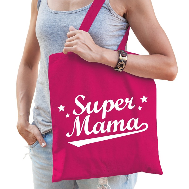 Katoenen moeder kado tasje super mama in de kleur knal roze. Leuk om cadeau te geven aan je moeder, bijvoorbeeld met Moederdag, haar verjaardag of gewoon zomaar. Dit roze katoenen tasje is eenzijdig bedrukt met de tekst Super mama.