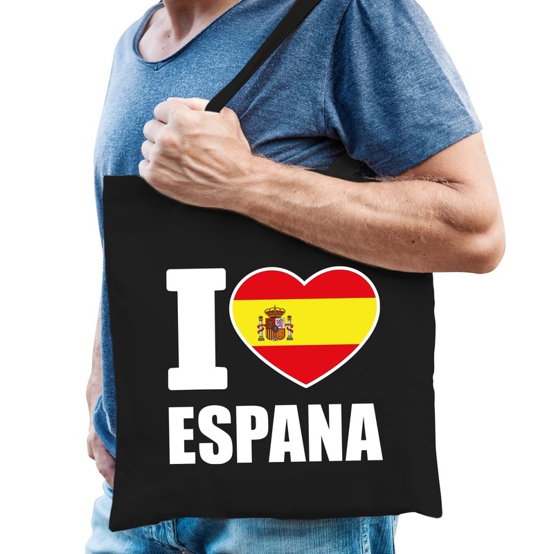 Katoenen Spanje tasje: I love Espana in de kleur zwart. Dit zwarte katoenen tasje is eenzijdig bedrukt met de afbeelding van een hart in de Spaanse kleuren en de tekst I love Espana.