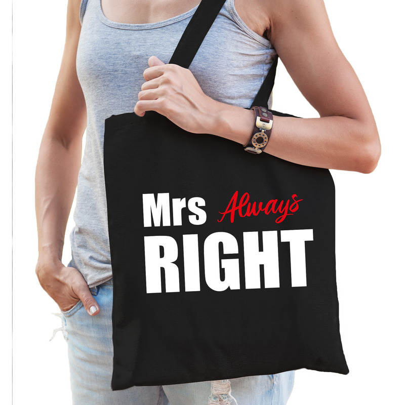 Katoenen tas / shopper zwart met de tekst Mrs Always right in witte en roze letters voor dames. Deze tas / shopper is leuk om cadeau te geven of gewoon om zelf te dragen, bijvoorbeeld op een vrijgezellenfeest. Dit zwart katoenen tasje is eenzijdig bedrukt met de tekst: Mrs always right.