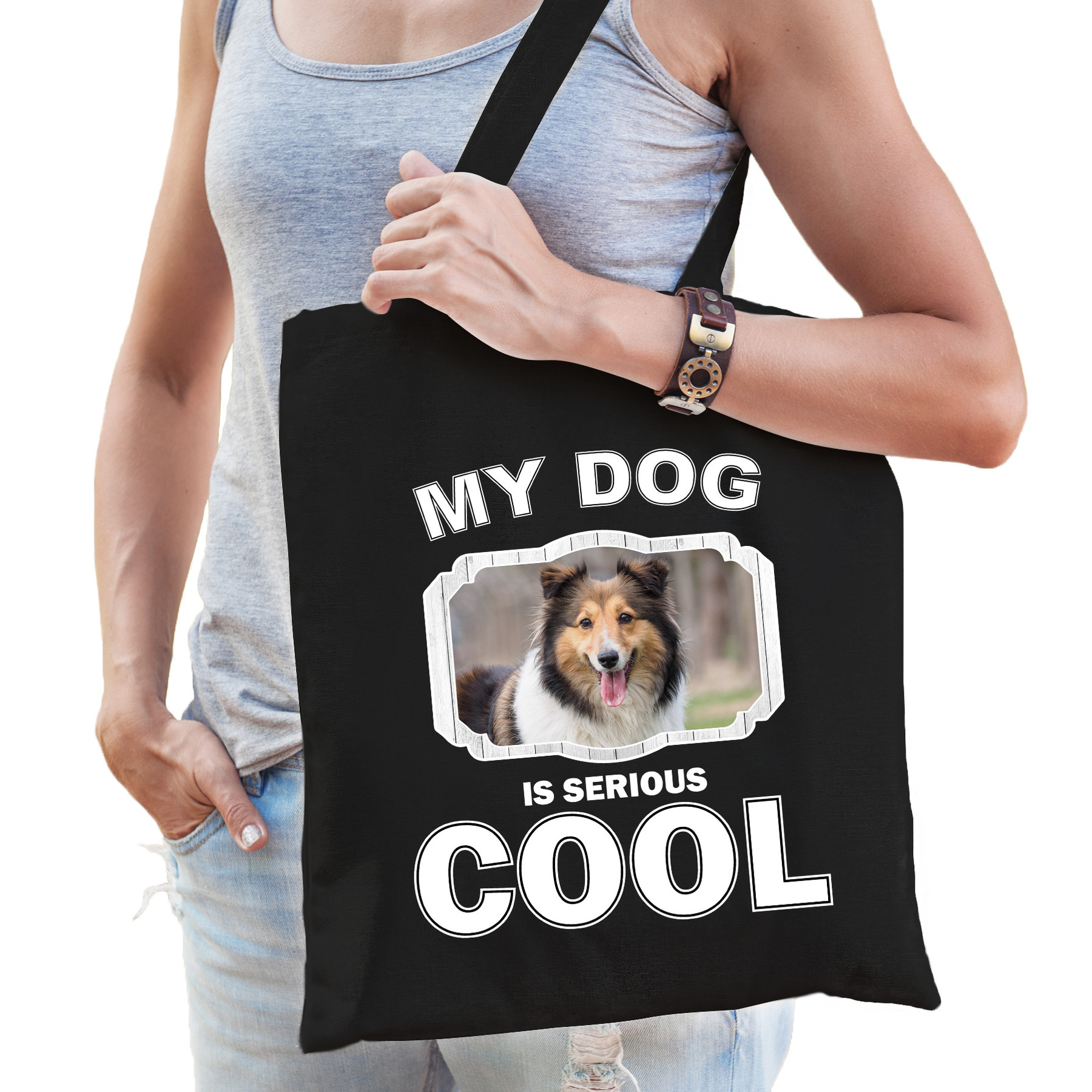 Sheltie honden tasje zwart volwassenen en kinderen. Op deze tas staat een Sheltie afbeelding en de tekst: my dog is serious cool. Een musthave voor een echte dieren/ Shetland sheepdogs liefhebber of iemand die alles van honden spaart. Erg leuk om cadeau te doen aan een echte Shetland sheepdogs fan of gewoon om zelf te gebruiken!