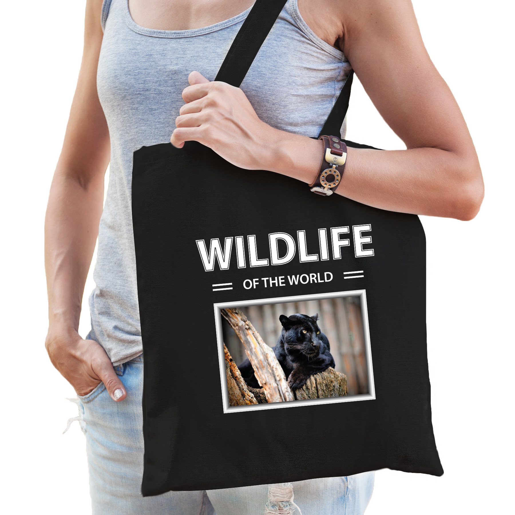 Zwarte panter tasje zwart voor volwassenen en kinderen. Op deze tas staat een Zwarte panter afbeelding en de tekst: wildlife of the world. Een musthave voor een echte dieren/ Zwarte panter liefhebber of iemand die alles van Panters spaart. Erg leuk om cadeau te doen aan een echte Zwarte panter fan of gewoon om zelf te gebruiken!