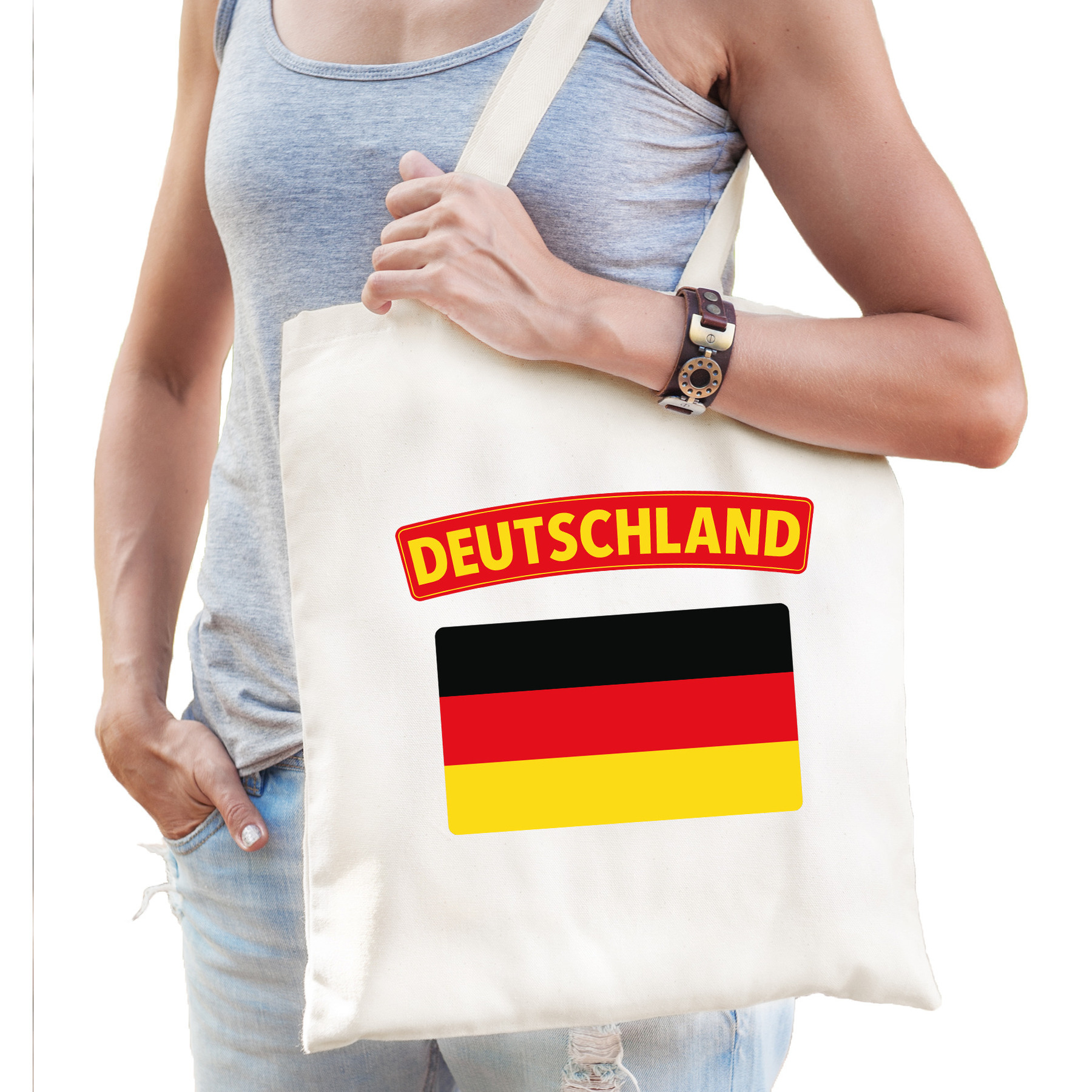 Katoenen tasje wit Deutschland / Duitsland supporter in de kleur wit. Dit witte katoenen tasje is eenzijdig bedrukt met de Duitse vlag en daarboven in gele letters in een rood vlak de tekst: Deutschland. Laat zien dat je een echte Duitsland fan bent met deze tas.