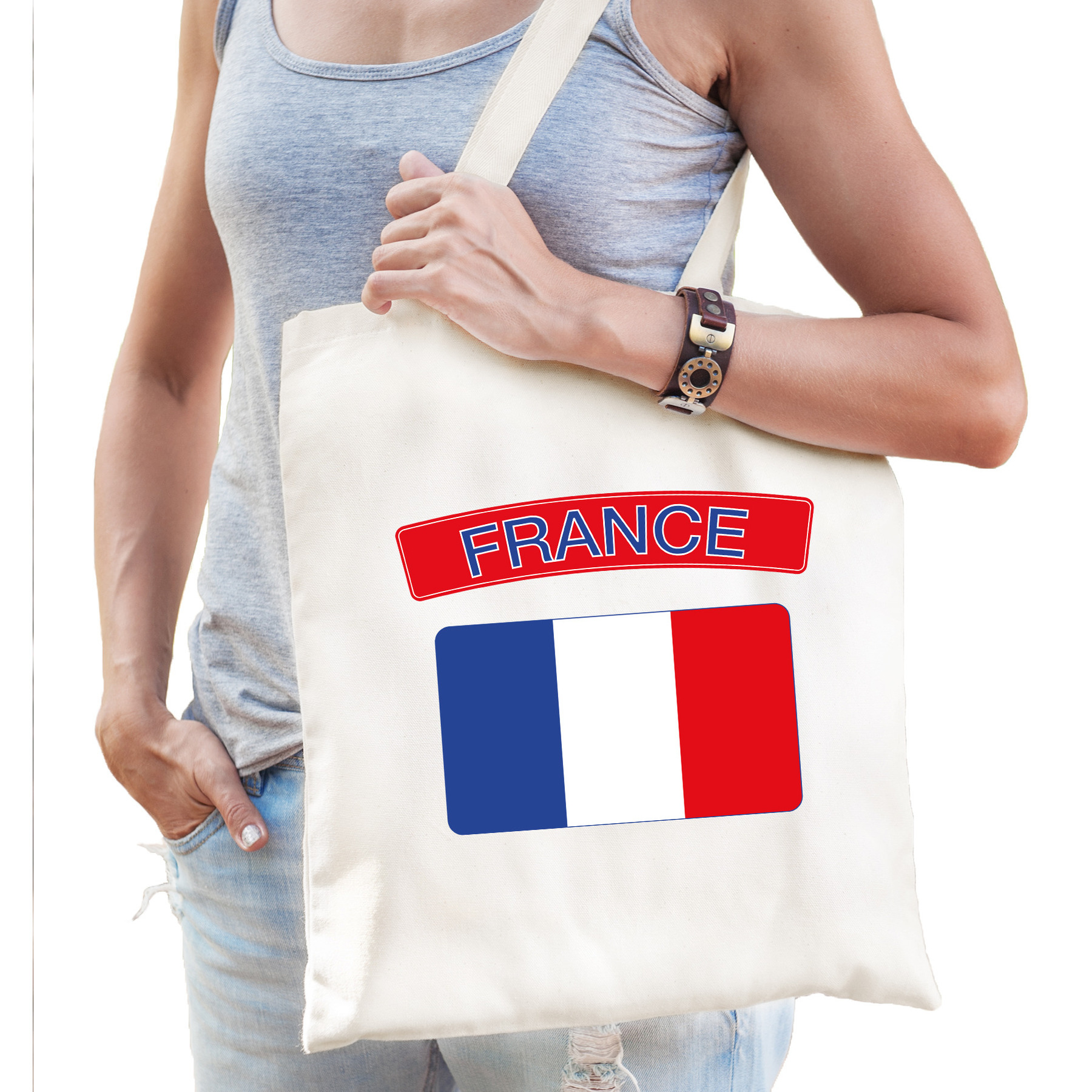 Katoenen tasje wit France / Frankrijk supporter in de kleur wit. Dit witte katoenen tasje is eenzijdig bedrukt met de Franse vlag en daarboven in blauwe letters in een rood vlak de tekst: France. Laat zien dat je een echte Frankrijk fan bent met deze tas.