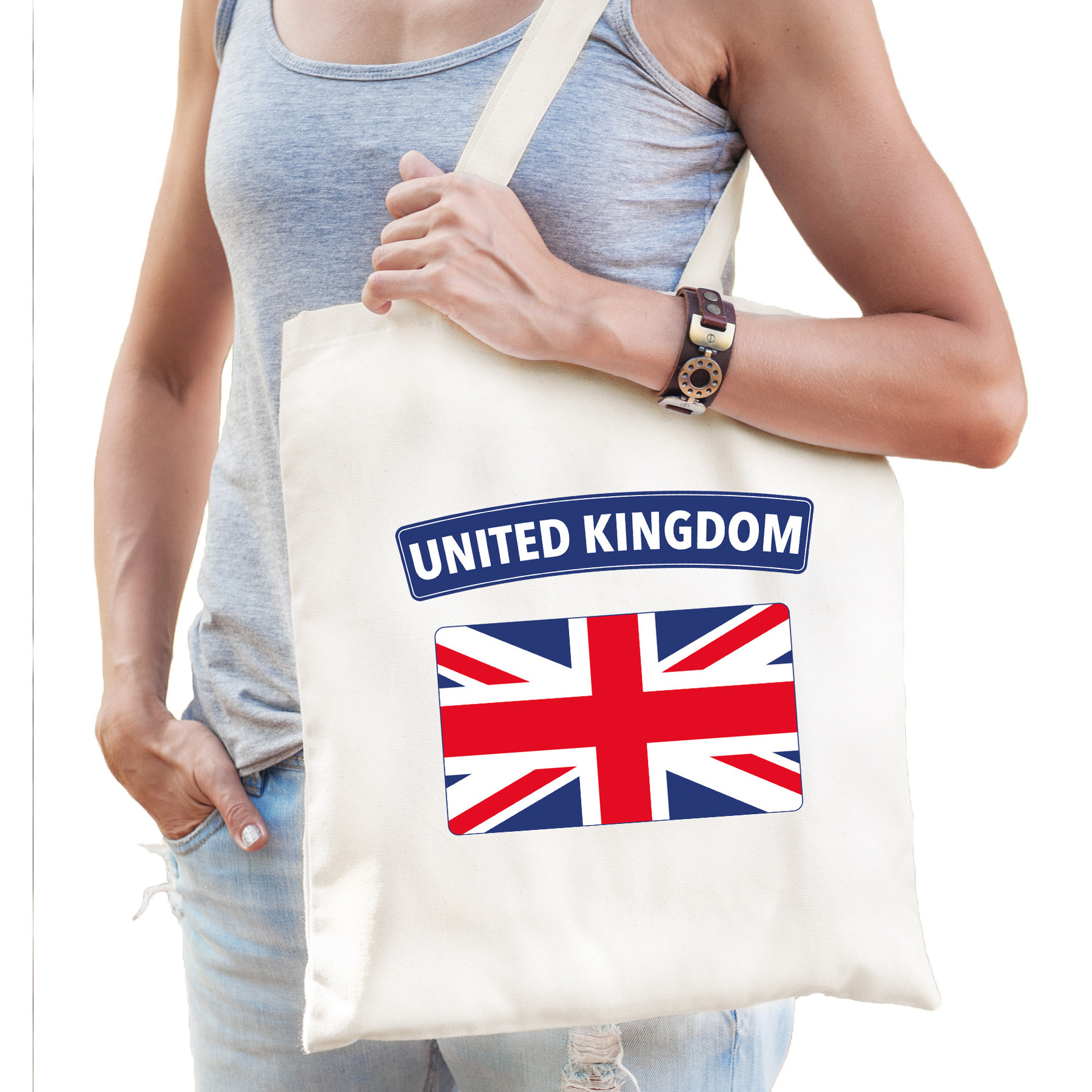 Katoenen tasje wit United Kingdom / Verenigd Koninkrijk / Engeland supporter in de kleur wit. Dit witte katoenen tasje is eenzijdig bedrukt met de Britse vlag / Union Jack en daarboven in witte letters in een blauw vlak de tekst: United Kingdom. Laat zien dat je een echte Engeland / Groot Brittannie fan bent met deze tas.