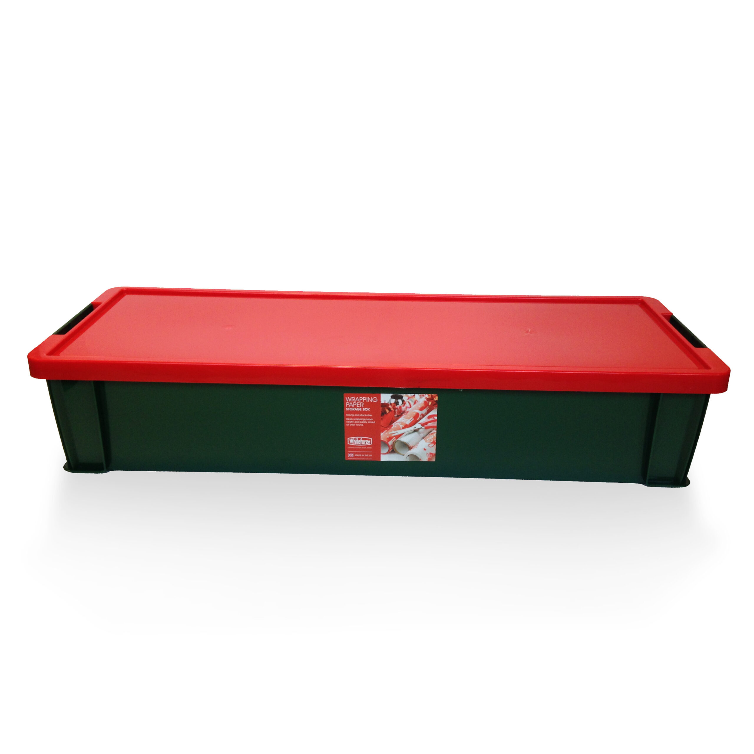 Kerst inpakpapier/cadeaupapier opbergbox met een inhoud van 27 liter. Deze handige box is speciaal ontwikkeld voor het opbergen van al je kerst cadeaupapier. De box is eenvoudig af te sluiten met de bijgeleverde deksel. Materiaal: kunststof. Formaat: 81 x 28 x 16 cm.