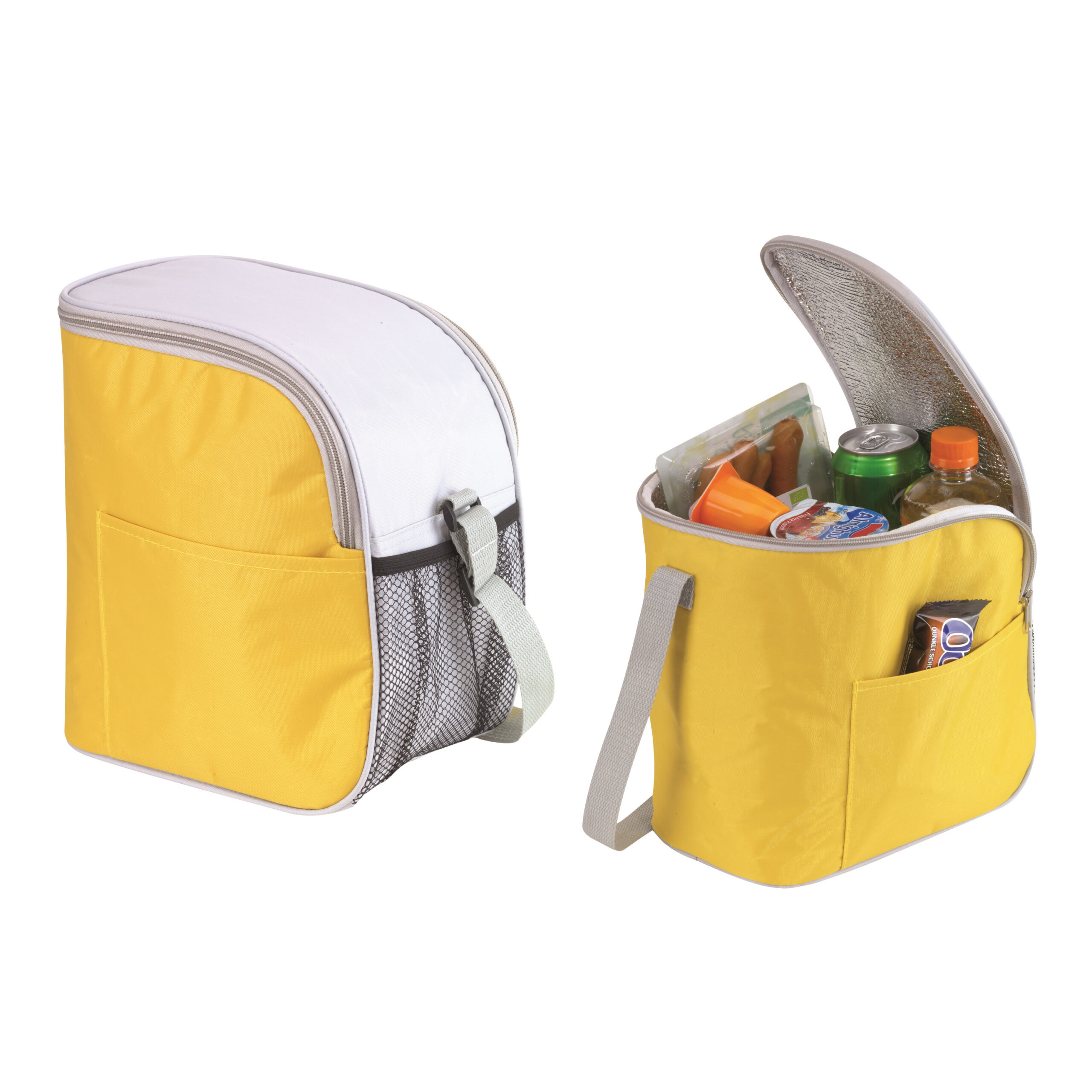 2x kleine koeltas of lunch tas model Glaciaal met afmetingen 23 x 16 x 26 cm. Deze handige koeltas heeft 1 compartiment en een klein voorvakje. Kleuren: geel/grijs. Compact model. Materiaal: polyester. Met draaghengsel. Voedselveilig en makkelijk schoon te maken. Inhoud: 9 liter. Er kunnen makkelijk blikjes, flesjes en voedsel/fruit in.