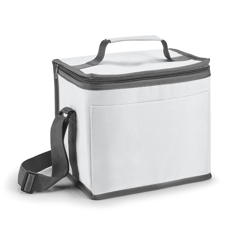 Handige koeltas met voorvak om uw lunch of six-pack blikjes koel te houden. Kleur: wit. Afmetingen: 24 x 22 x 17 cm. Inhoud ca. 9 liter. Materiaal: polyester. Koeltassen voor het hele jara.