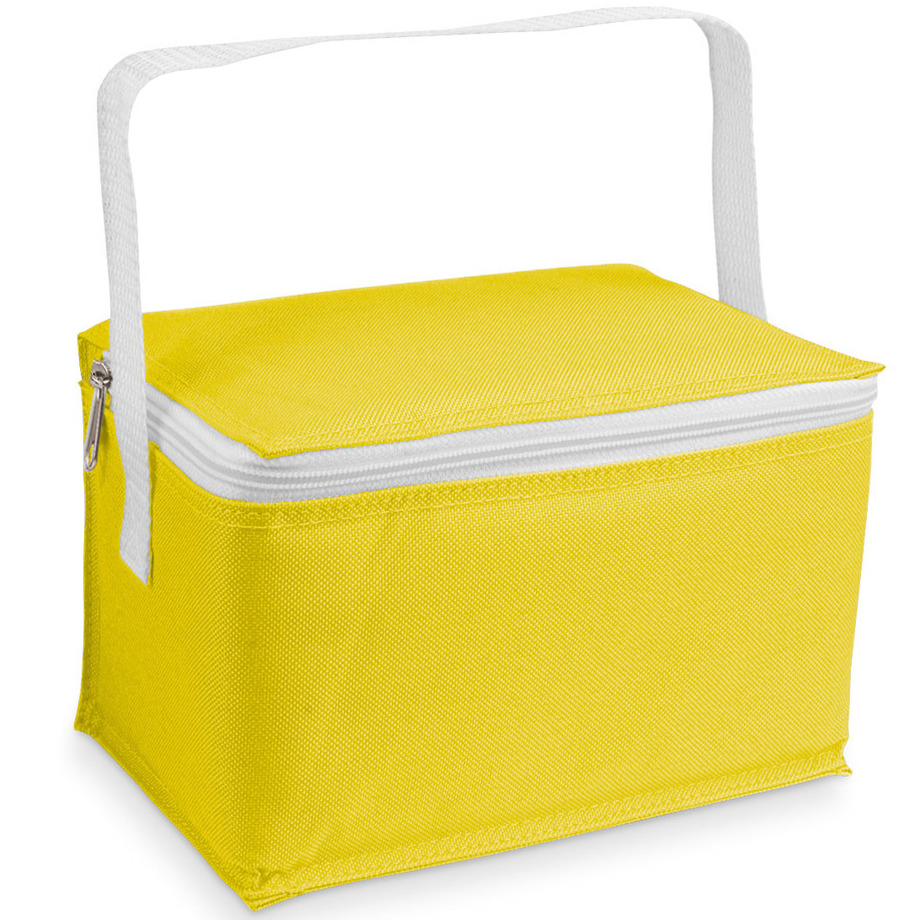 Handige gele koeltas om uw lunch of six-pack blikjes koel te houden. Afmetingen: 20 x 14 x 12 cm. Inhoud ca. 3.5 liter. Materiaal: polyester.