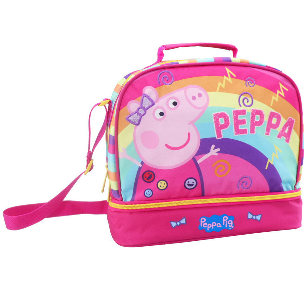 Handige koeltas voor kinderen roze met Peppa Pig print om de lunch koel te houden. De koeltas bevat twee verschillende vakken met rits. Afmetingen: 27 x 13 x 24 cm. Inhoud ca. 8 liter. Materiaal: polyester, PVC.