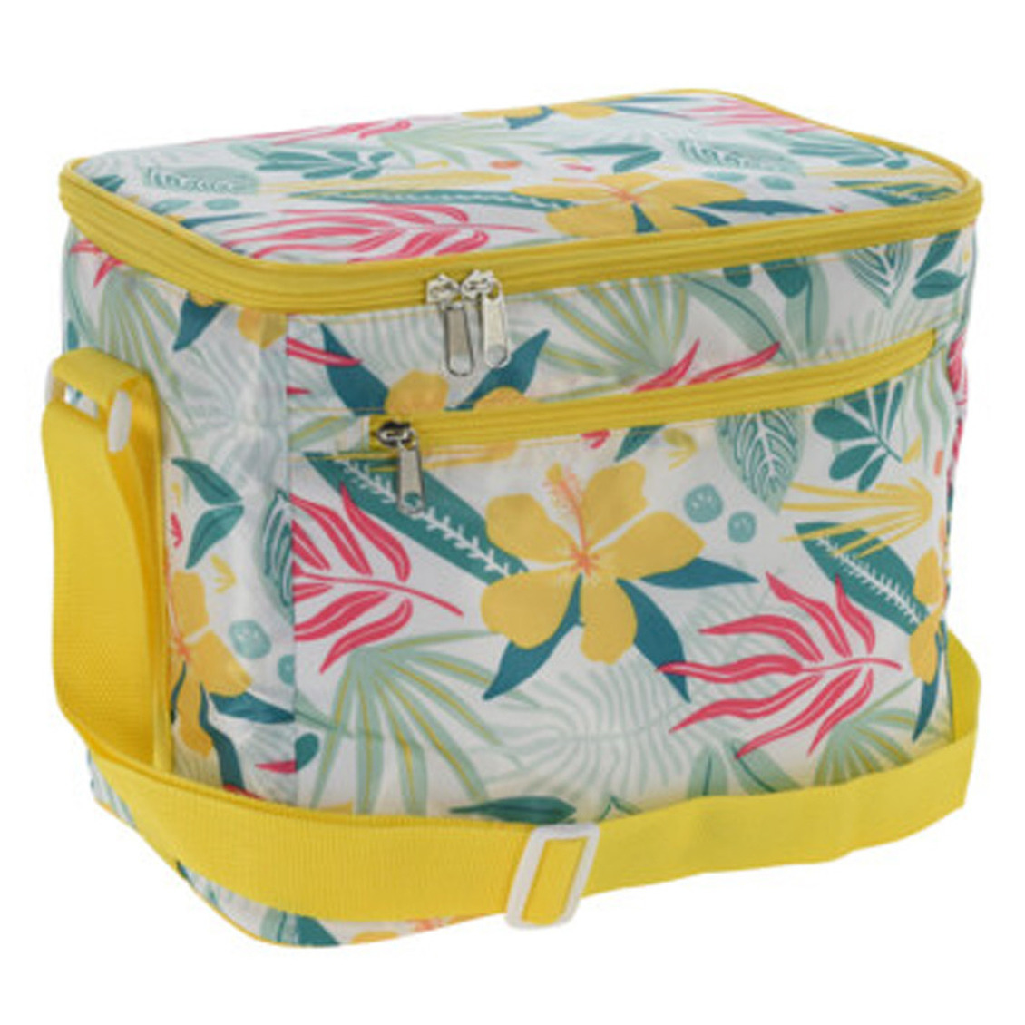 Handige kleine koeltas om uw lunch of six-pack blikjes koel te houden in het geel/creme met mooie tropische bloemen print. Afmetingen: 30 x 20 x 25 cm. Inhoud ca. 12 liter. Materiaal: foam/polyester. Met schouderband en voorvakje voor kleine spulletjes.
