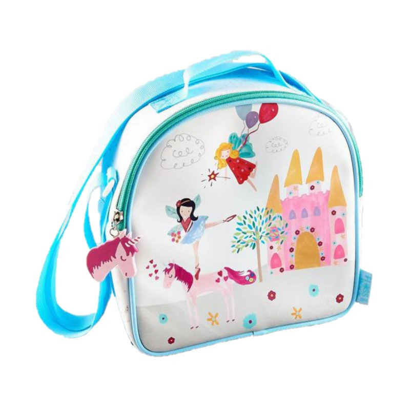 Handige koeltas voor kinderen wit/licht blauw met sprookjes print om de lunch koel te houden.De koeltas heeft een vak met een speciaal elastiek waarmee een bidon of fles van 300 ml op zijn plaats gehouden kan worden en aan de binnenkant vindt u een naamlabel. Afmetingen: 9 x 22 x 22 cm. Inhoud ca. 4 liter. Materiaal: polyester, PVC.