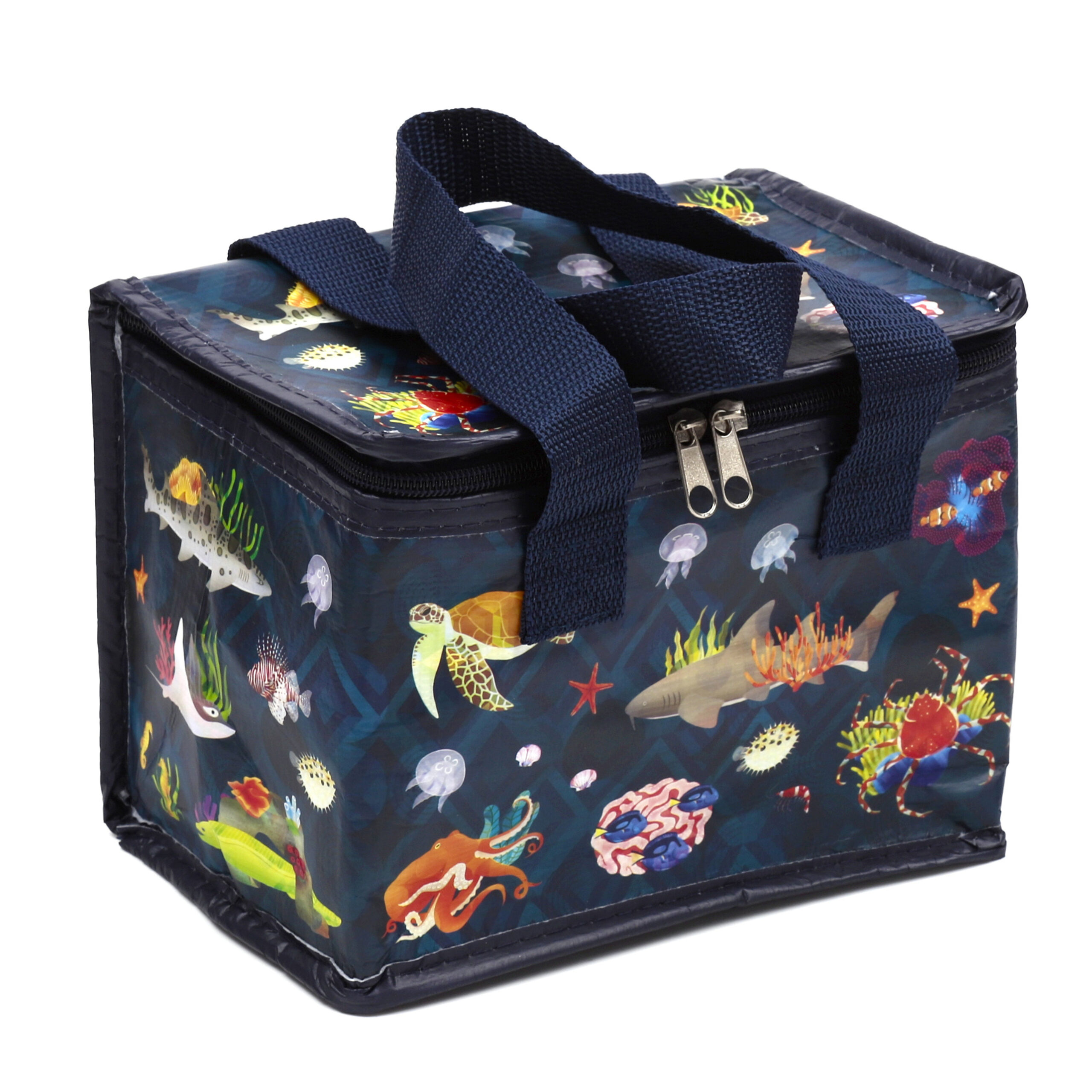 Handige klein model lunch koeltas met een prachtige Sealife kingdom print om uw lunch of six-pack blikjes koel te houden. Afmetingen: 20 x 15 x 14 cm. Inhoud ca. 4,7 liter. Materiaal: RPET gerecycled kunststof. Voedsel en dranken kunnen nu langer warm, koud en vers blijven.