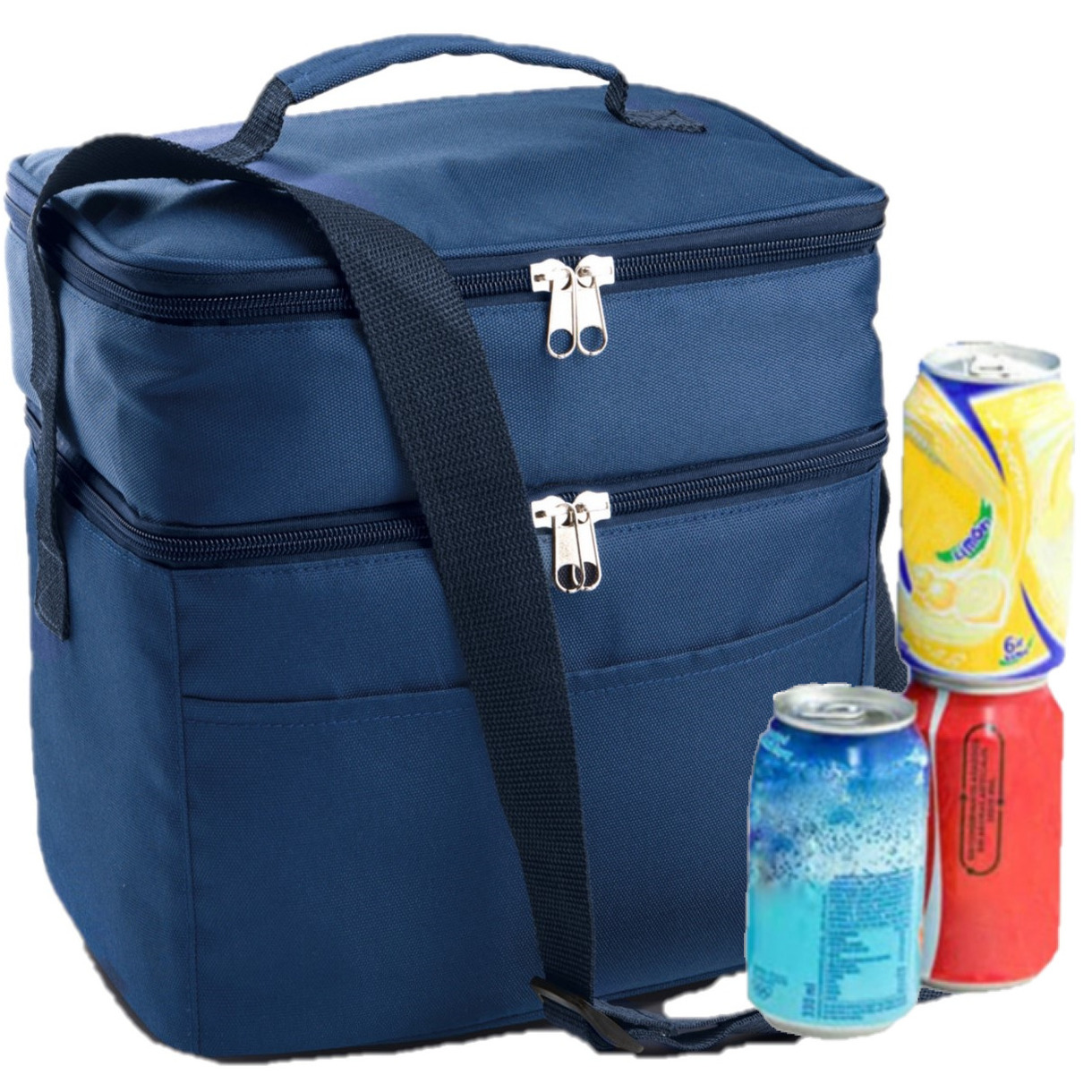 Koeltas draagtas schoudertas blauw 26 x 19 x 26 cm 13 liter. Handige blauwe koeltas draagtas/schoudertas met dubbel vak en voorvak. Materiaal: polyester.