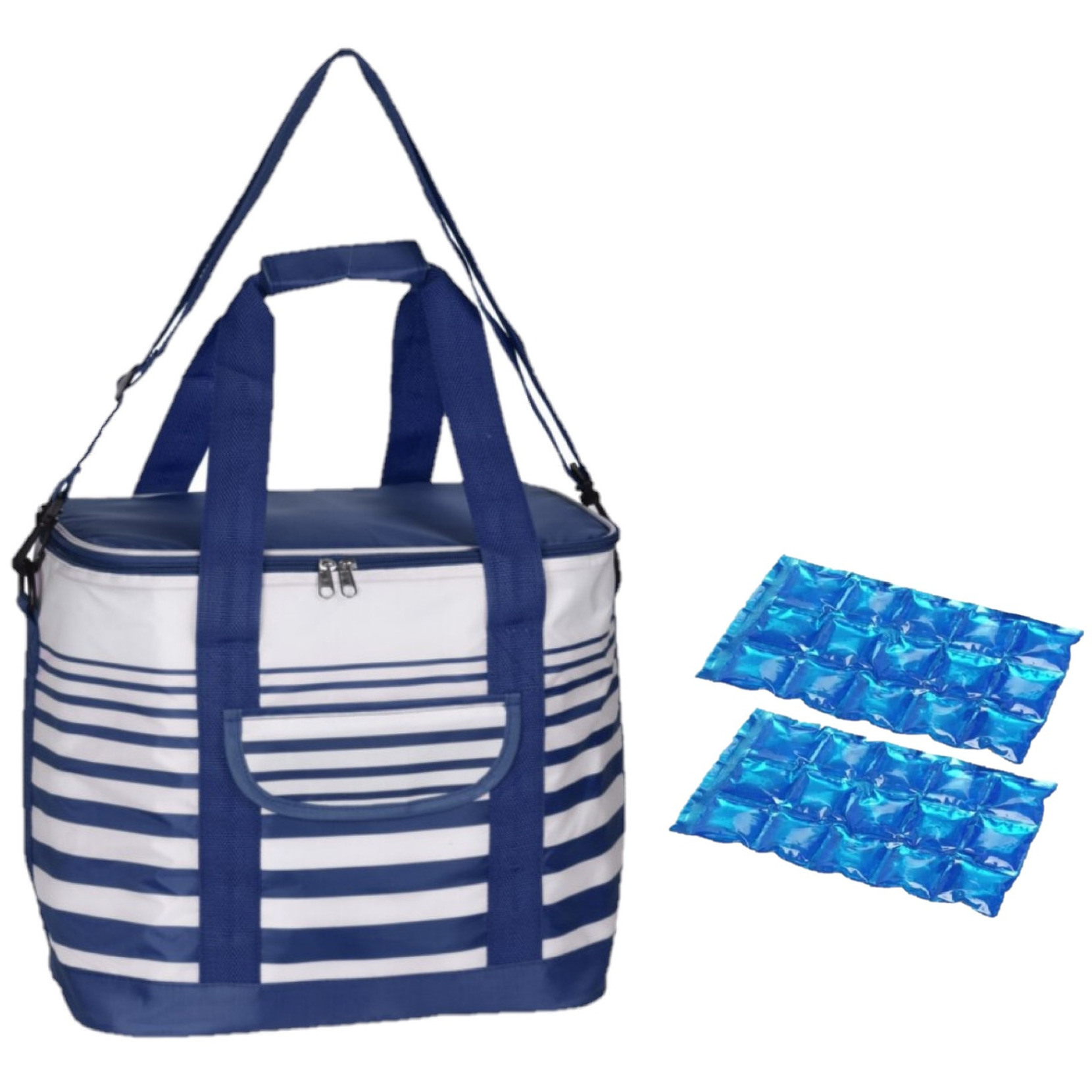 Koeltas draagtas schoudertas blauw/wit gestreept met 2 stuks flexibele koelelementen. De flexibele koelelementen zijn herbruikbaar. Afmeting koeltas: ca. 28 x 18 x 29 cm. Inhoud koeltas: ca 12 liter. Materiaal koeltas: polyester. , Dit artikel bestaat uit:, 2x 1x Stuks herbruikbare flexibele koelelementen icepack 15 x 25 cm, 1x Koeltas draagtas schoudertas blauw/wit gestreept 28 x 18 x 29 cm 12 liter