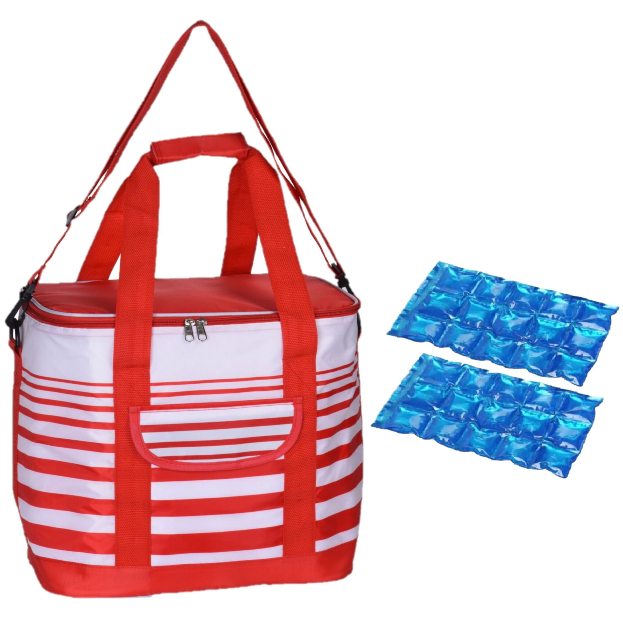 Koeltas draagtas schoudertas rood/wit gestreept met 2 stuks flexibele koelelementen. De flexibele koelelementen zijn herbruikbaar. Afmeting koeltas: ca. 28 x 18 x 29 cm. Inhoud koeltas: ca 12 liter. Materiaal koeltas: polyester. , Dit artikel bestaat uit:, 2x 1x Stuks herbruikbare flexibele koelelementen icepack 15 x 25 cm, 1x Koeltas draagtas schoudertas – rood/wit gestreept – 28 x 18 x 29 cm – 12 liter – Koeltassen