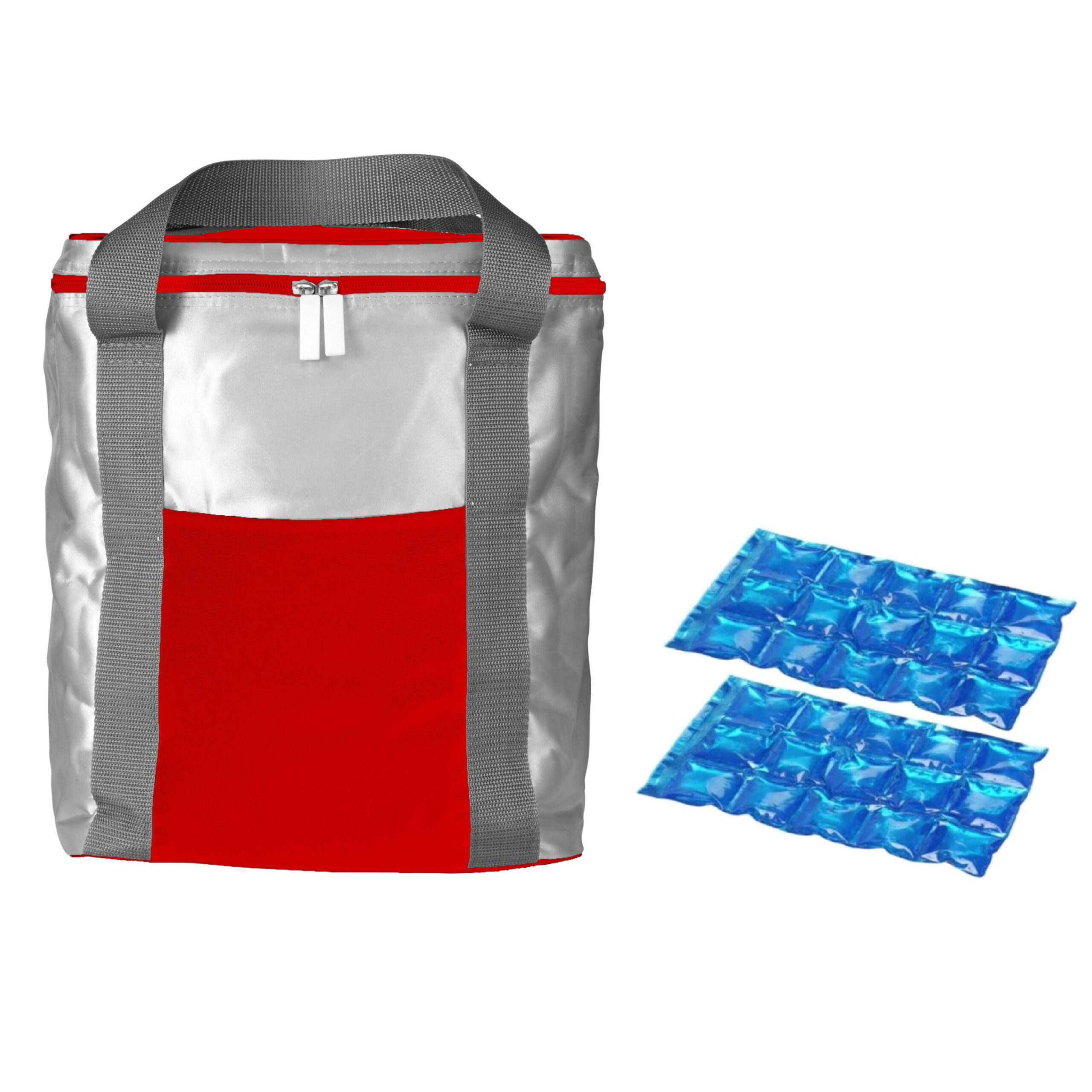 Koeltas rood/zilver met 2 stuks flexibele koelelementen. De flexibele koelelementen zijn herbruikbaar. Afmeting koeltas: ca. 34 x 28 x 16 cm. Inhoud koeltas: ca. 15 liter. Materiaal koeltas: polyester. , Dit artikel bestaat uit:, 2x 1x Stuks herbruikbare flexibele koelelementen icepack 15 x 25 cm, 1x Koeltas rood/zilver 34 x 28 x 16 cm 15 liter