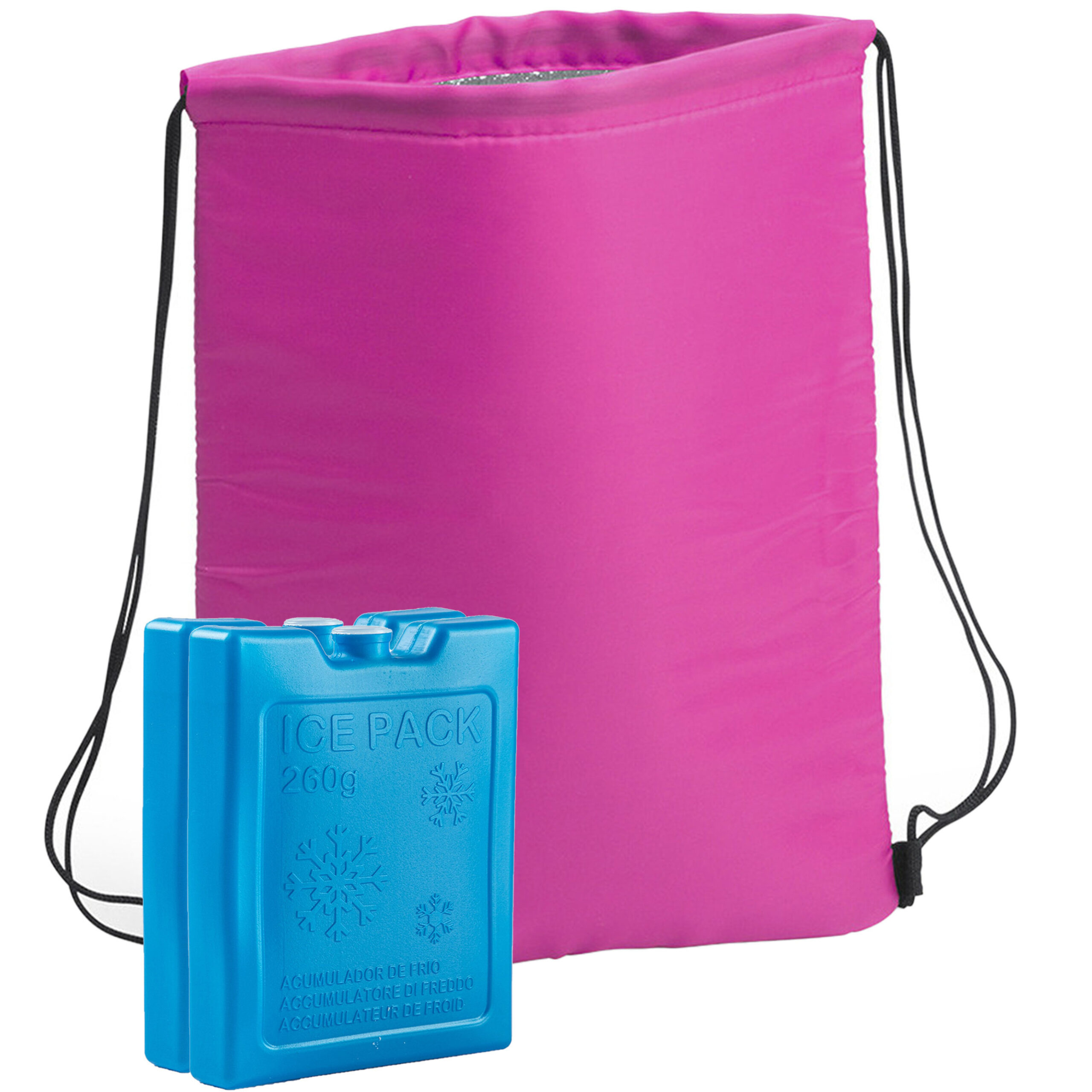 Koeltas rugtas roze met rijgkoord cm met 2x koelelementen van 13 x 10 cm. Formaat rugtas: 32 x 42 cm. Materiaal: polyester. Houdt uw lunch of drankjes gekoeld. De rugzak heeft versterkte hoeken en is perfect voor onderweg. , Dit artikel bestaat uit:, 1x Koeltasje rugzak met draagkoord – roze – 32 x 42 cm – drankjes/lunch rugtas – polyester/aluminium, 2x Plasticforte 260 grams koelelementen – 13 x 10 x 2 cm – blauw – kunststof