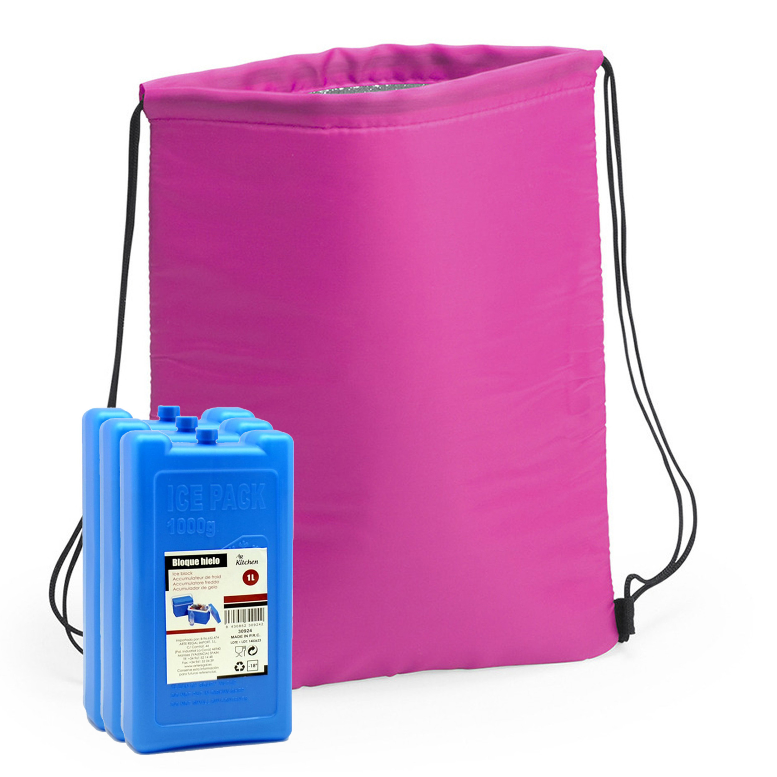 Koeltas rugtas roze met rijgkoord cm met 2x koelelementen. Formaat: 32 x 42 cm. Materiaal: polyester. Houdt uw lunch of drankjes gekoeld. De rugzak heeft versterkte hoeken en is perfect voor onderweg. , Dit artikel bestaat uit:, 1x Koeltasje rugzak met draagkoord – roze – 32 x 42 cm – drankjes/lunch rugtas – polyester/aluminium, 2x Arte R Koelelementen groot blok – 1000 ml – 11 x 5 x 22 cm – blauw – voor koeltas/koelbox