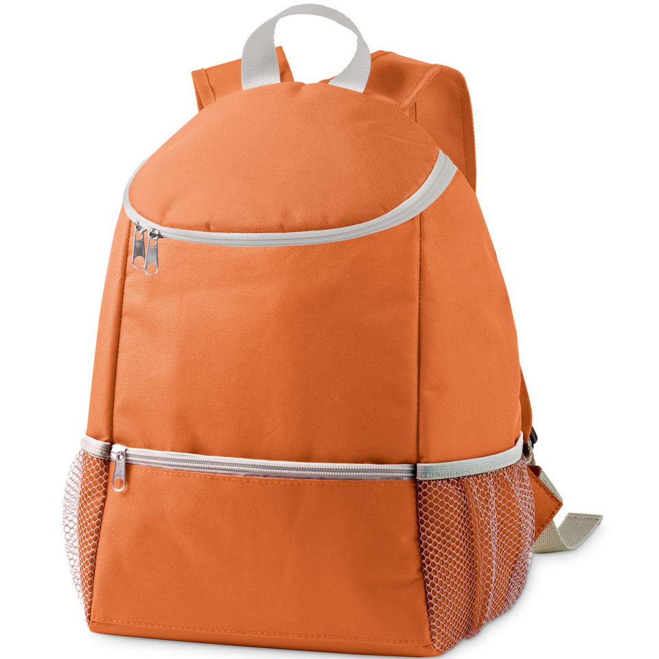 Koeltas rugtas/rugzak met voor en zijvakken. Kleur: oranje. Afmeting: 28 x 14 x 34 cm. Inhoud: 10 liter. Materiaal: polyethyleen. Draagbare koeltas voor op je rug om drankjes en hapjes mee te nemen.