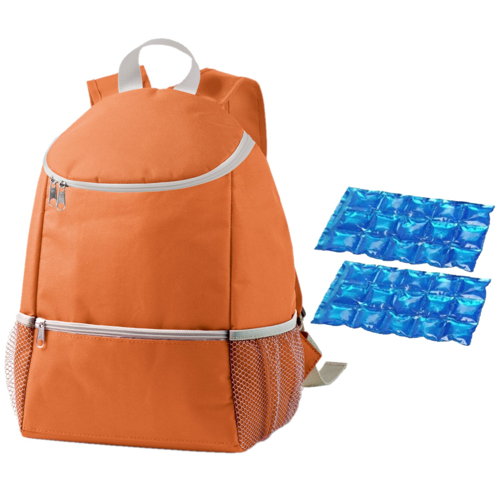 Koeltas rugtas/rugzak oranje met 2 stuks flexibele koelelementen. De flexibele koelelementen zijn herbruikbaar. Afmeting koeltas: ca. 28 x 34 x 14 cm. Inhoud koeltas: ca. 10 liter. Materiaal koeltas: polyethyleen. , Dit artikel bestaat uit:, 2x 1x Stuks herbruikbare flexibele koelelementen icepack 15 x 25 cm, 1x Koeltas rugtas/rugzak 28 x 14 x 34 cm – 10 liter – Oranje – Koeltassen – Koelrugzak