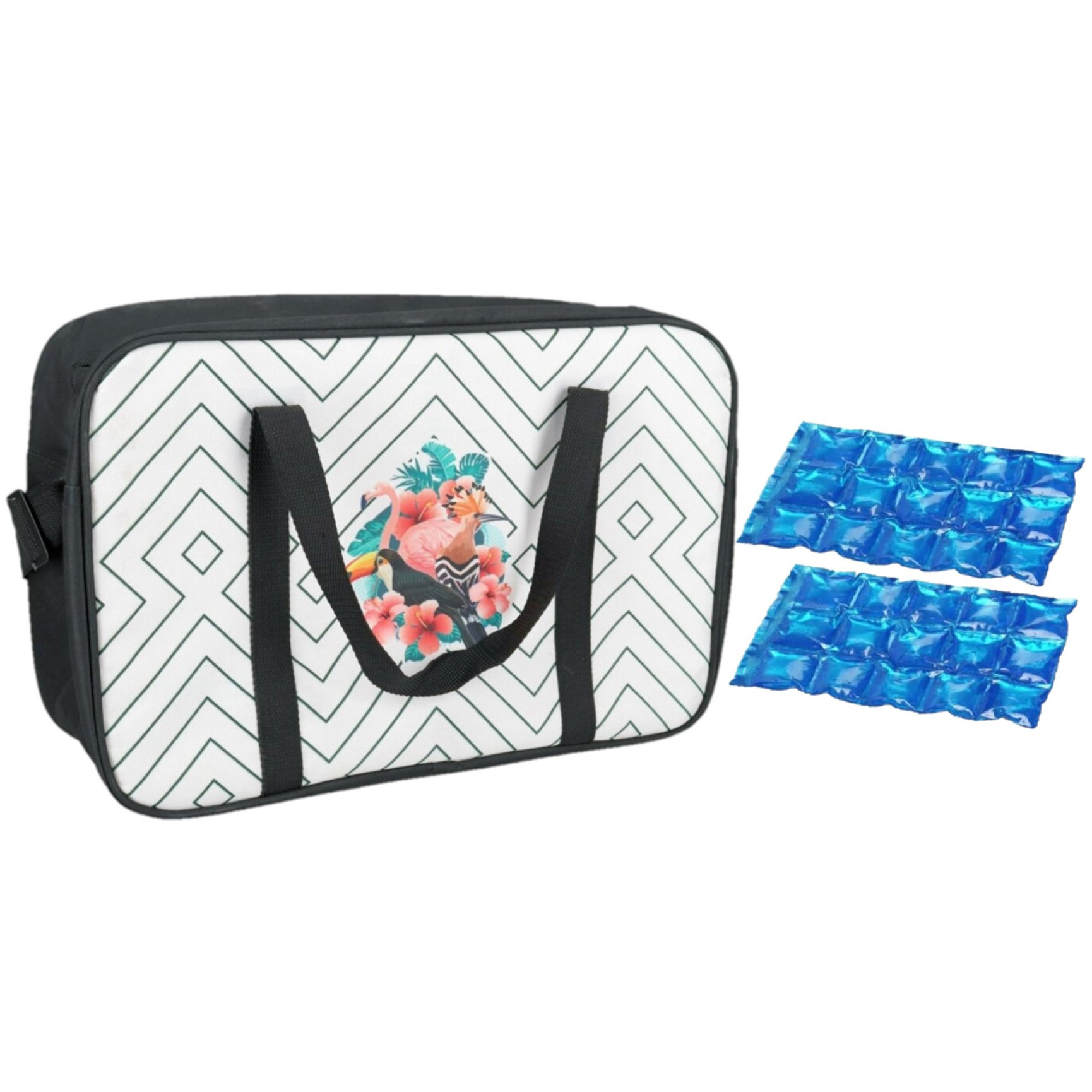 Koeltas zwart/wit met tropische vogels print met 2 stuks flexibele koelelementen. De flexibele koelelementen zijn herbruikbaar. Afmeting koeltas: ca. 40 x 30 x 16 cm. Inhoud koeltas: ca. 18 liter. Materiaal koeltas: polyester. , Dit artikel bestaat uit:, 2x 1x Stuks herbruikbare flexibele koelelementen icepack 15 x 25 cm, 1x Koeltas zwart/wit met tropische vogels print 40 x 30 x 16 cm 18 liter