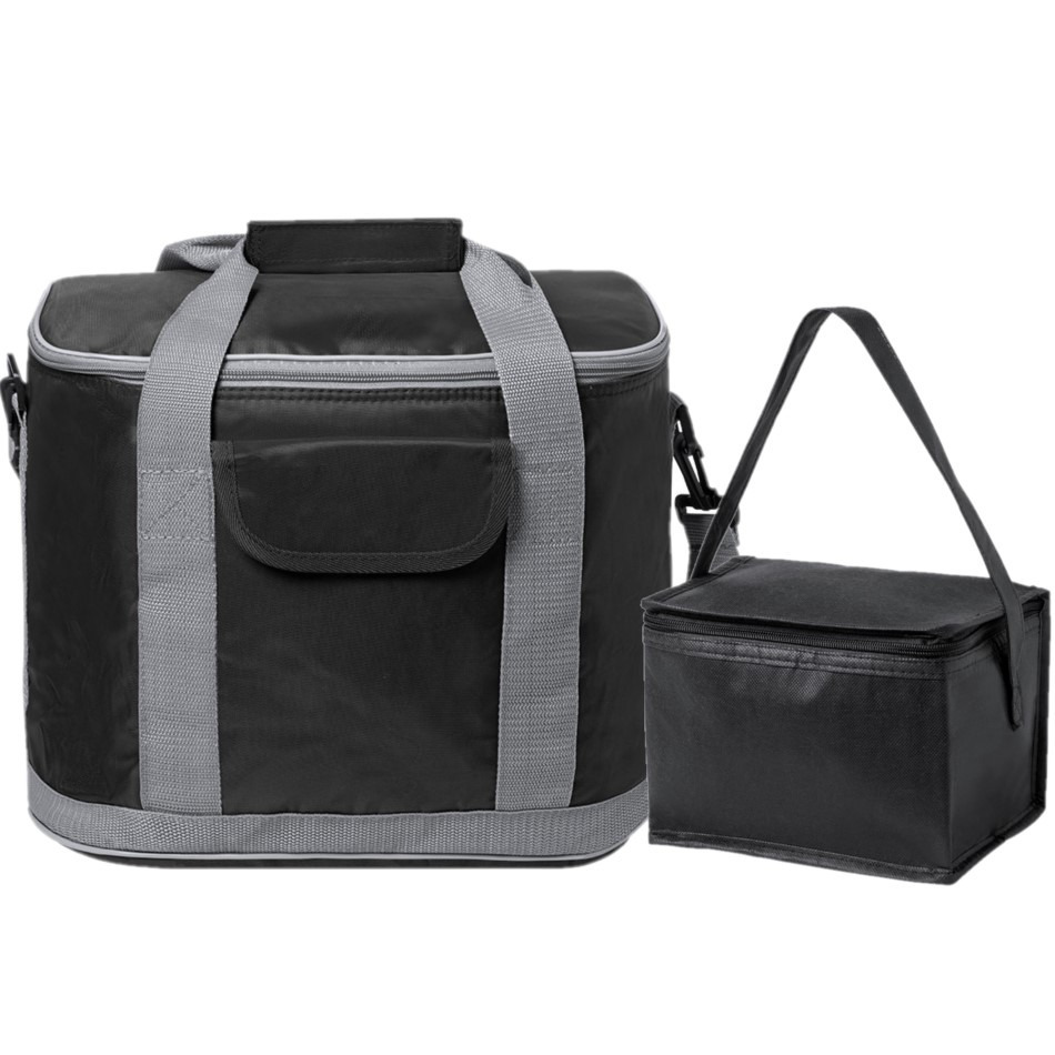 Koeltassen set zwart 22 en 4 liter. Koeltassen set bestaande uit een grote koeltas draagtas/schoudertas van 22 liter en een kleine koeltas lunchtas/sixpack van 4 liter.