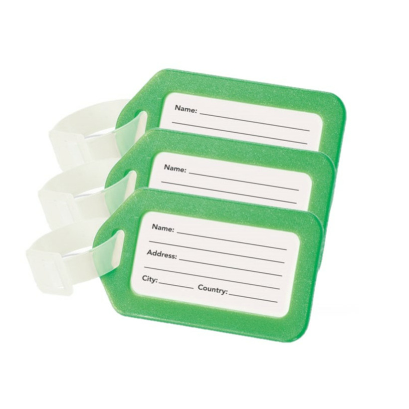 3 stuks kofferlabel/adres en informatie bagagelabel van kunststof, in de kleur groen. Afmetingen: 8 x 5. Materiaal: kunststof en papier. Handige artikelen om uw tassen en koffers te labelen voor op reis.