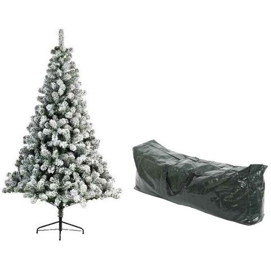 Kunst kerstboom Imperial pine 525 tips met sneeuw 180 cm en een groene kerstboom opbergzak. Groene volle kunstboom van 180 cm hoog en ongeveer 117 cm diameter. De boom heeft 525 tips en heeft een metalen voet van ongeveer 50 cm diameter. Met tas om de boom in op te bergen. 100% PVC. Besneeuwde kunstbomen/kerstbomen. Afmeting zak: 120 x 25 x 43 cm, materiaal: geweven plastic. , Dit artikel bestaat uit:, 1x Kerstboom opbergzak – groen – voor kerstbomen tot 210 cm – 120 x 25 x 43 cm, 1x Bellatio Decorations kunst kerstboom – 180 cm – sneeuw – 525 takken