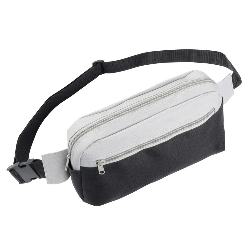 Lichtgrijs/zwart heuptasje/buideltasje voor volwassenen. Deze heuptas heeft groot hoofdvak met rits, een voorvak met rits, 2 insteekvakjes aan zijkant en een verstelbare heupgordel met bucklesluiting. Afmeting ca: 28 x 17 x 7 cm, de lengte van de riem is verstelbaar tot ca. 96 cm. Materiaal: 600D polyester. Tevens te dragen als schoudertasje.