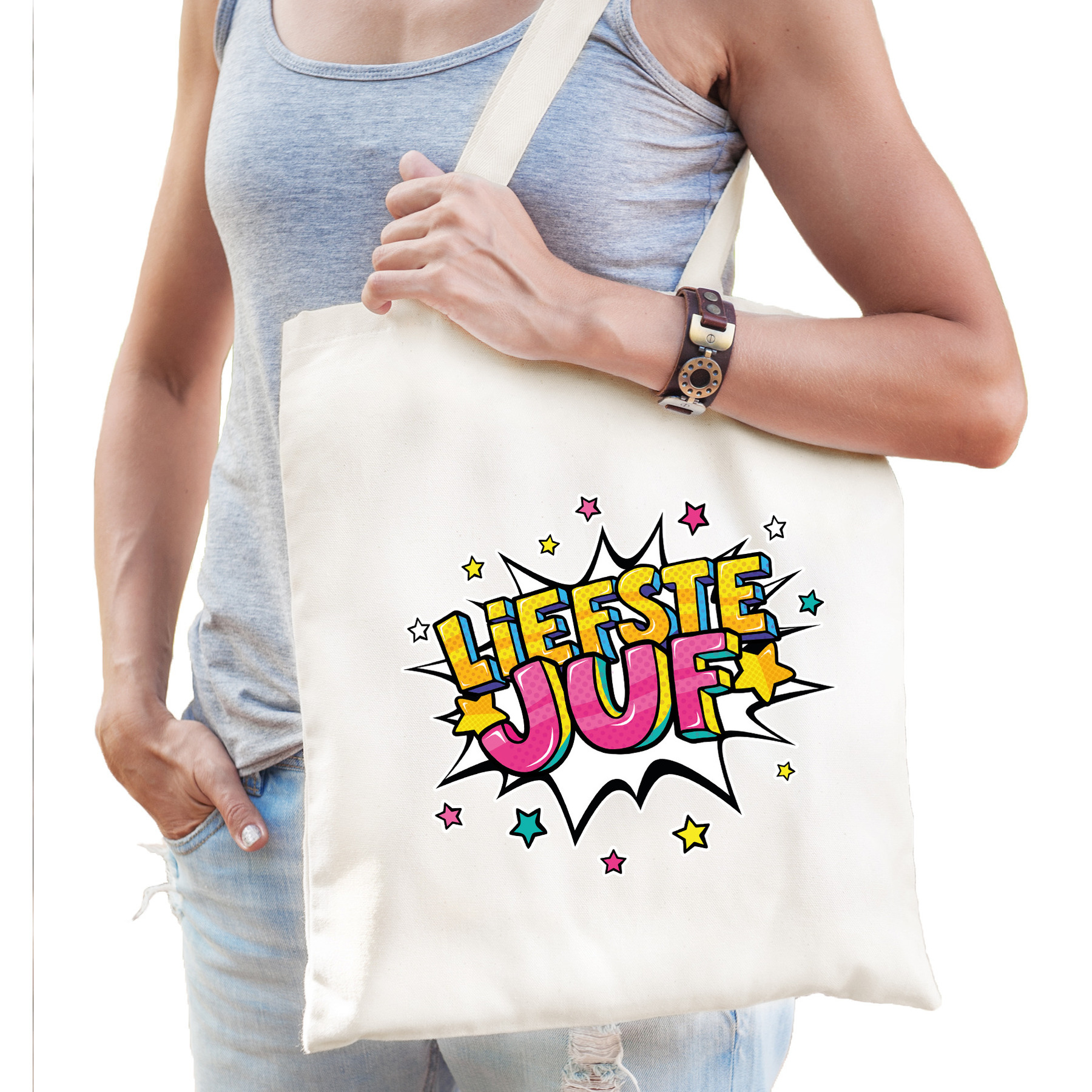 Liefste juf popart katoenen tas wit voor dames. Dit witte katoenen tasje is eenzijdig bedrukt in gele en roze popart stijl letters met de tekst: Liefste juf.
