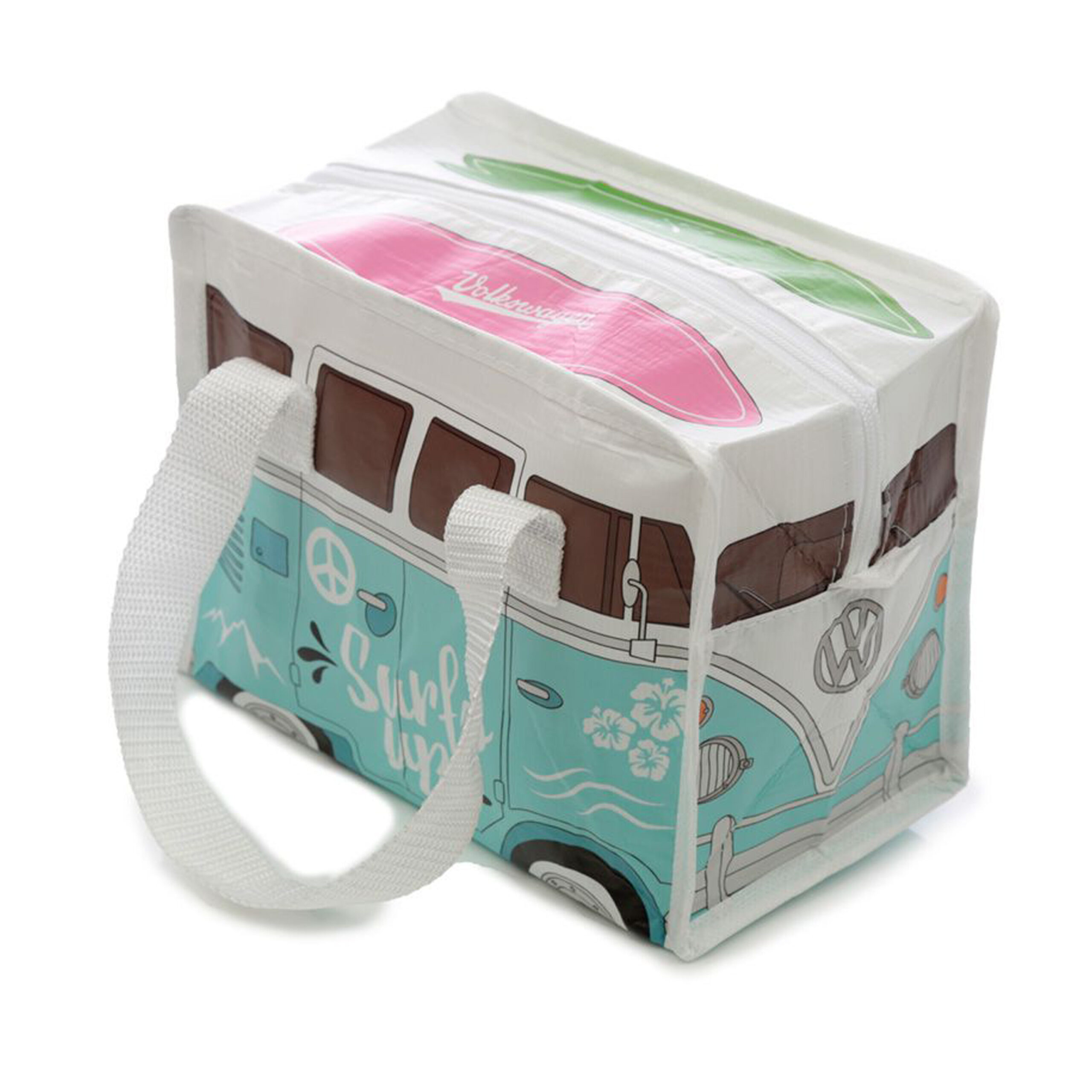 Lunchtas in de kleur licht blauw met een oude Volkswagen busje als print. De tas is gemaakt van gerestyled plastic en is ook weer recyclebaar. Deze kleine lunchtas heeft een rits en twee korte hengsels en heeft een formaat van 16 x 21 x 12 cm. Een ideaal tasje voor je lunchtrommel in mee te nemen. Ook handig voor als je een dag op pad gaat naar bijvoorbeeld het strand. Let op, dit is geen koeltas. Uiteraard zou je er wel koelelementen in kunnen doen om je eten/drinken koel te houden. Materiaal: RPET (gerecyclede plastic flessen) en polypropyleen (handvaten). Formaat: L16 x B21 x H12 cm. Inhoud: ca. 4 liter.