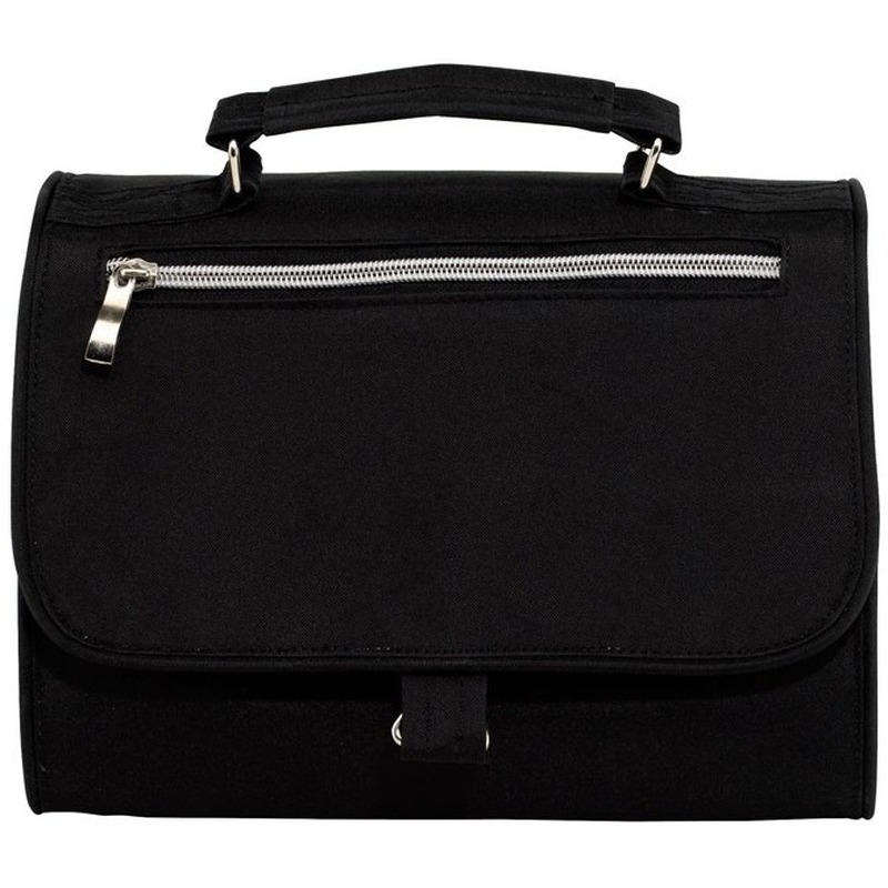 Een luxe toilettas/reisetui voor dames en heren in de kleur zwart. De tas heeft 5 compartimenten die ieder met een rits afsluitbaar zijn, een afneembare spiegel, een metalen haak en een stevig handvat. Afmeting: ca. 25 x 8 x 18 cm. Materiaal: polyester. Handbagage reis accessoires toilettassen/make-up tassen in de kleur zwart.