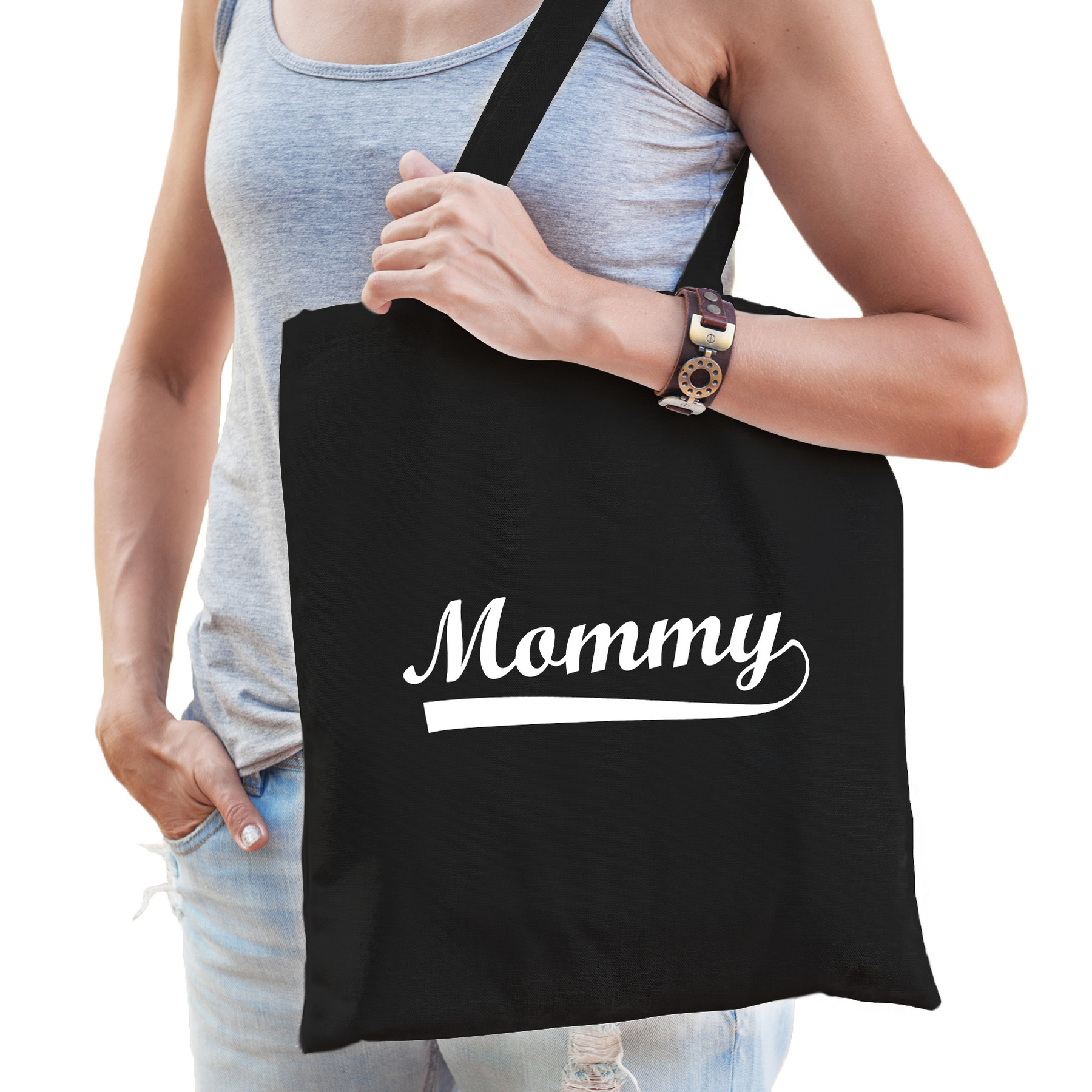 Cadeau tas mama – Mommy cadeau katoenen tas zwart voor dames. Op dit zwarte katoenen tasje staat in witte letters de tekst: Mommy. Met wimpel eronder.