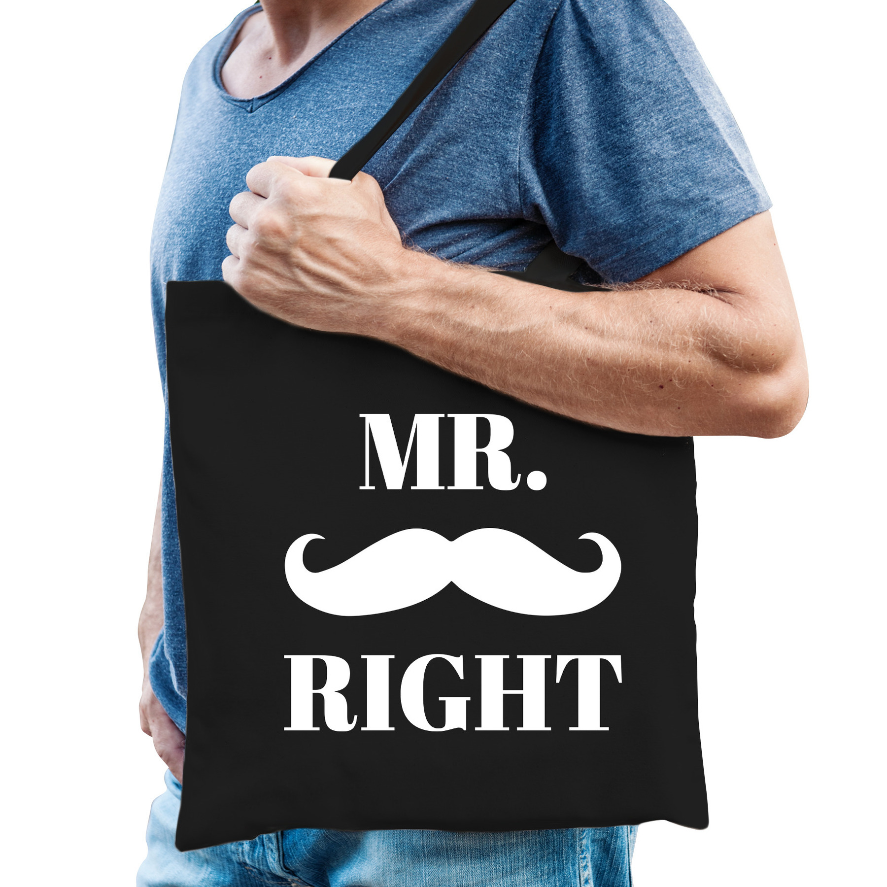 Mr right tasjes met snor heren. Deze tas / shopper is leuk om cadeau te geven of gewoon om zelf te dragen, bijvoorbeeld op een vrijgezellenfeest. Dit zwart katoenen tasje is eenzijdig bedrukt met de tekst: mr right en een snor.