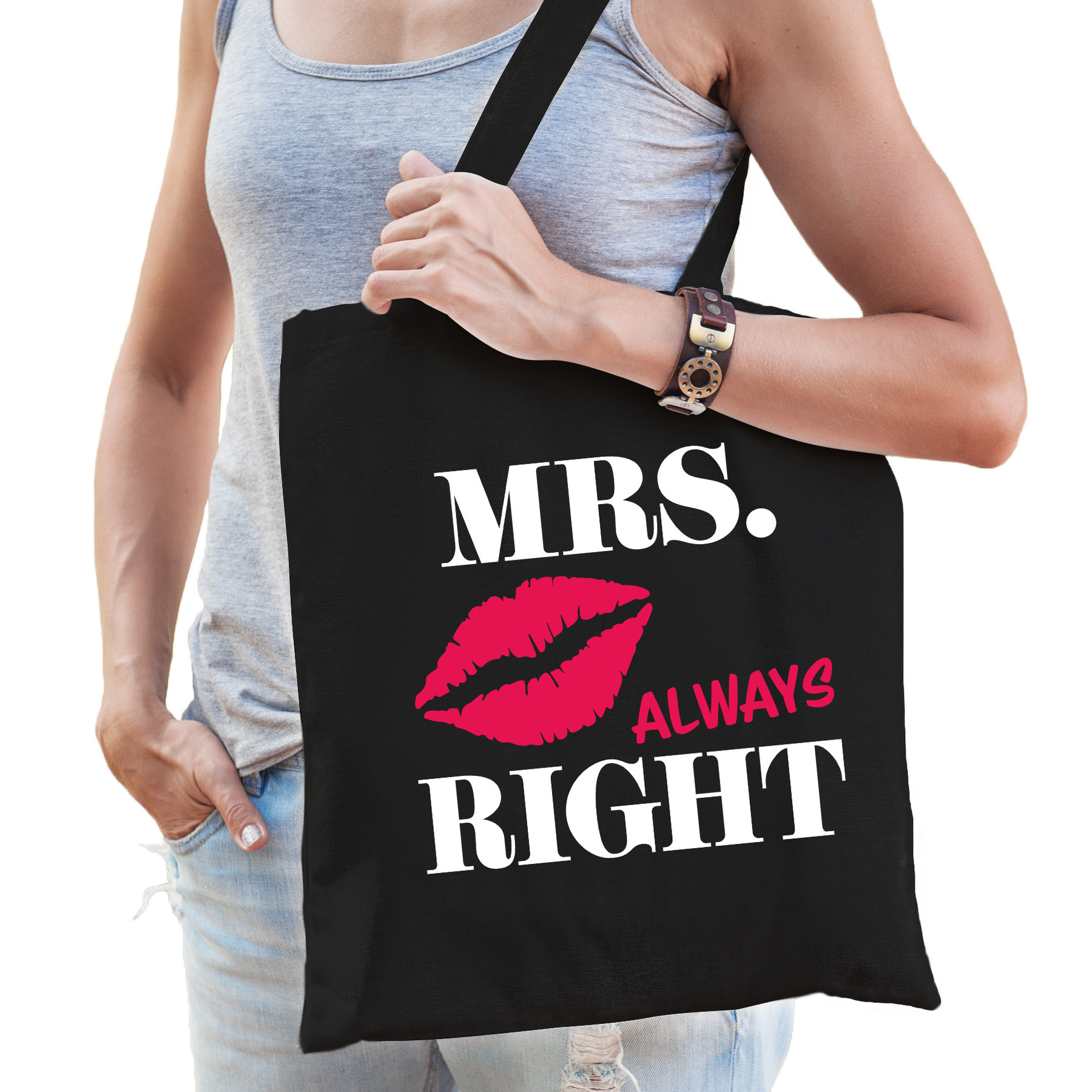 Mrs always Right tasje met lippen dames. Deze tas / shopper is leuk om cadeau te geven of gewoon om zelf te dragen, bijvoorbeeld op een vrijgezellenfeest. Dit zwart katoenen tasje is eenzijdig bedrukt met de tekst: Mrs always Right en lippen.